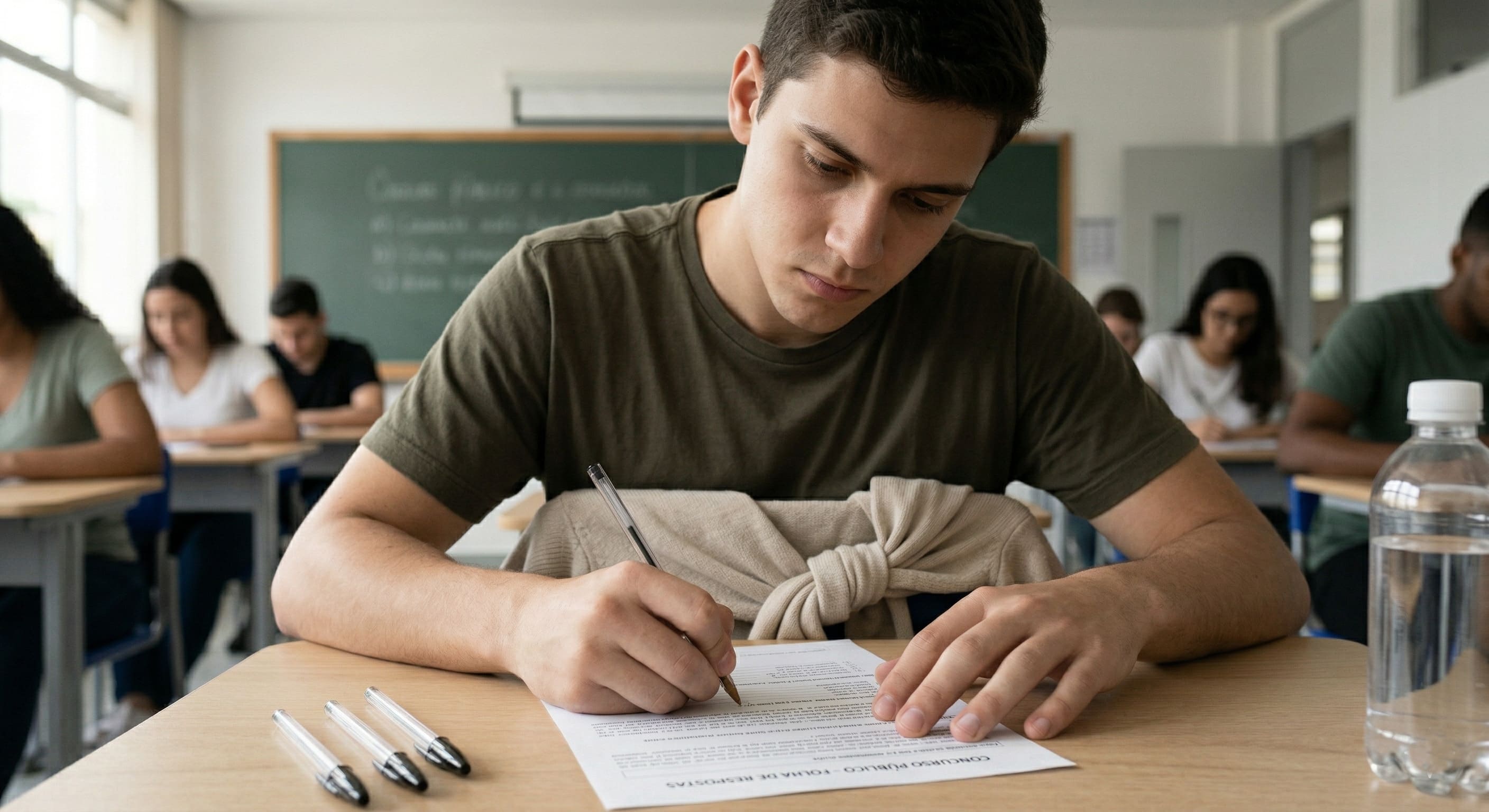 Alt Text : Candidato realizando prova de concurso público vestido com roupas confortáveis, sem acessórios eletrônicos, utilizando apenas materiais permitidos como caneta preta transparente e garrafa de água sem rótulo.