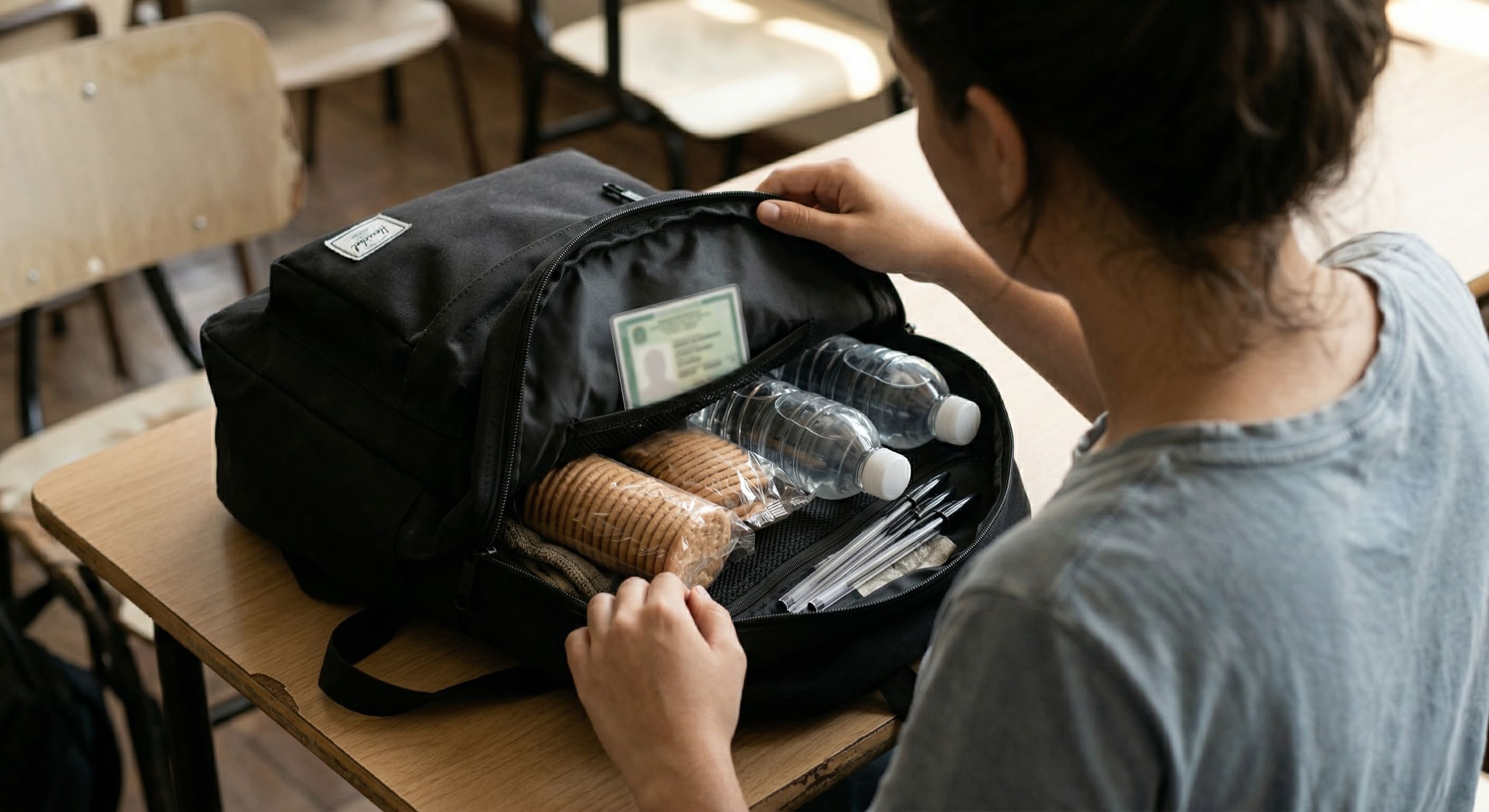 Alt Text : Foto de uma mochila sendo aberta, revelando itens essenciais e permitidos para concursos públicos: garrafas de água sem rótulo, lanches lacrados e canetas esferográficas pretas transparentes.