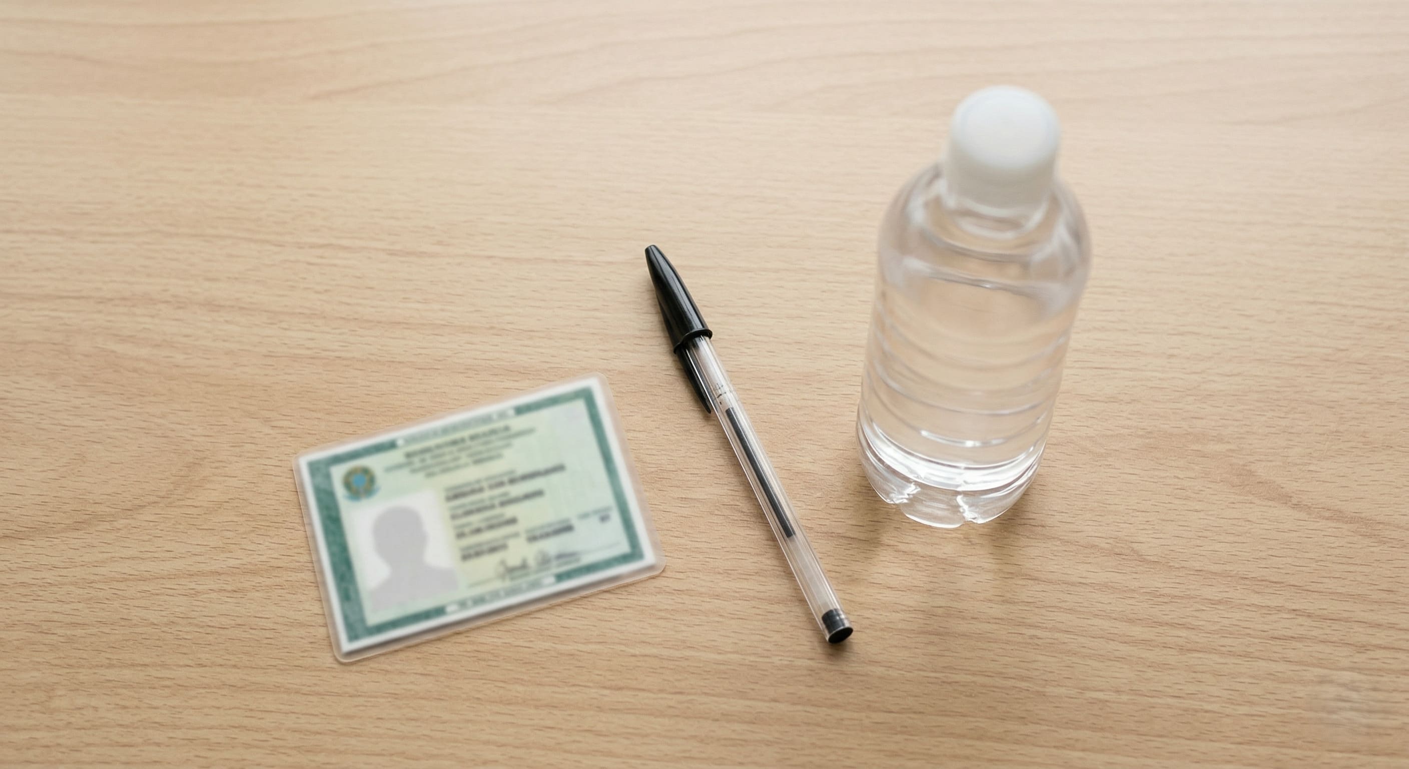 Alt Text : Fotografia vista de cima de uma mesa de madeira com uma caneta preta transparente, uma garrafa de água sem rótulo e um documento de identidade, representando os itens permitidos em uma prova de concurso público.