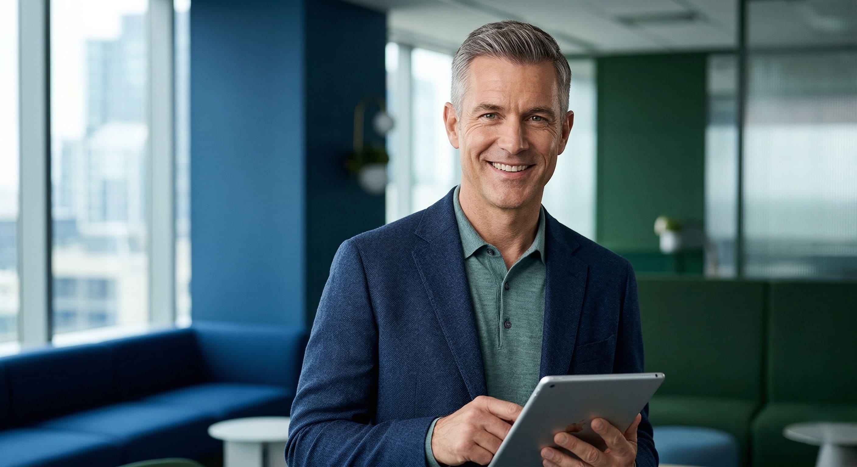 Alt Text: Servidor público sorrindo no escritório, ilustrando quem tem direito ao abono de permanência no Brasil e como funciona o benefício.