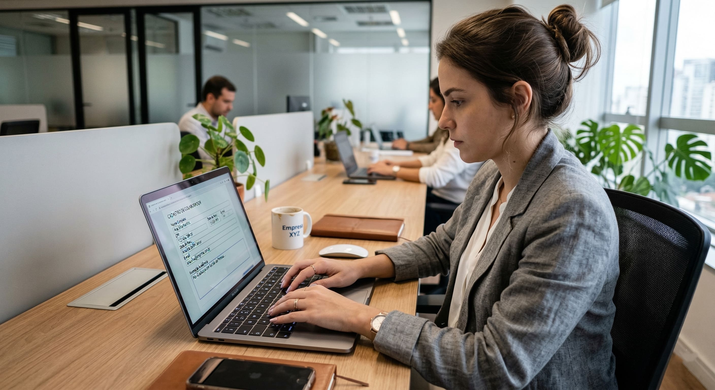 Alt Text: Pessoa preenchendo formulário online no notebook para solicitar o abono de permanência retroativo e verificar seus direitos.