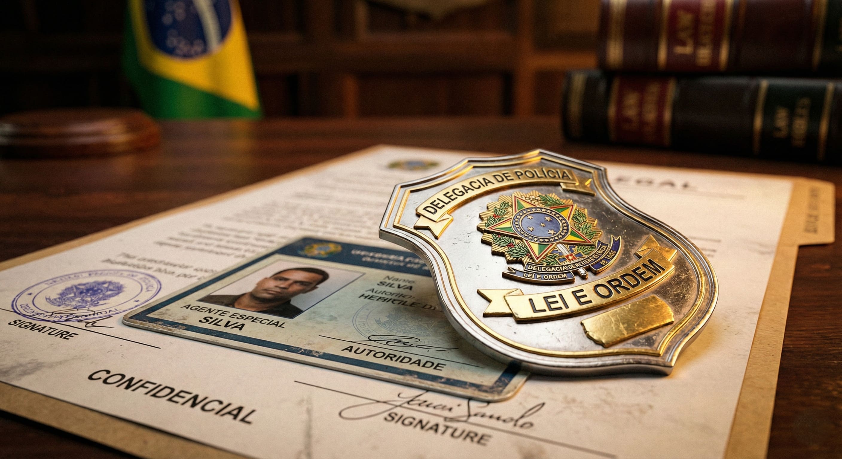 • Alt Text: Distintivo policial sobre documentos representando o elemento competência e autoridade legal nos atos administrativos.