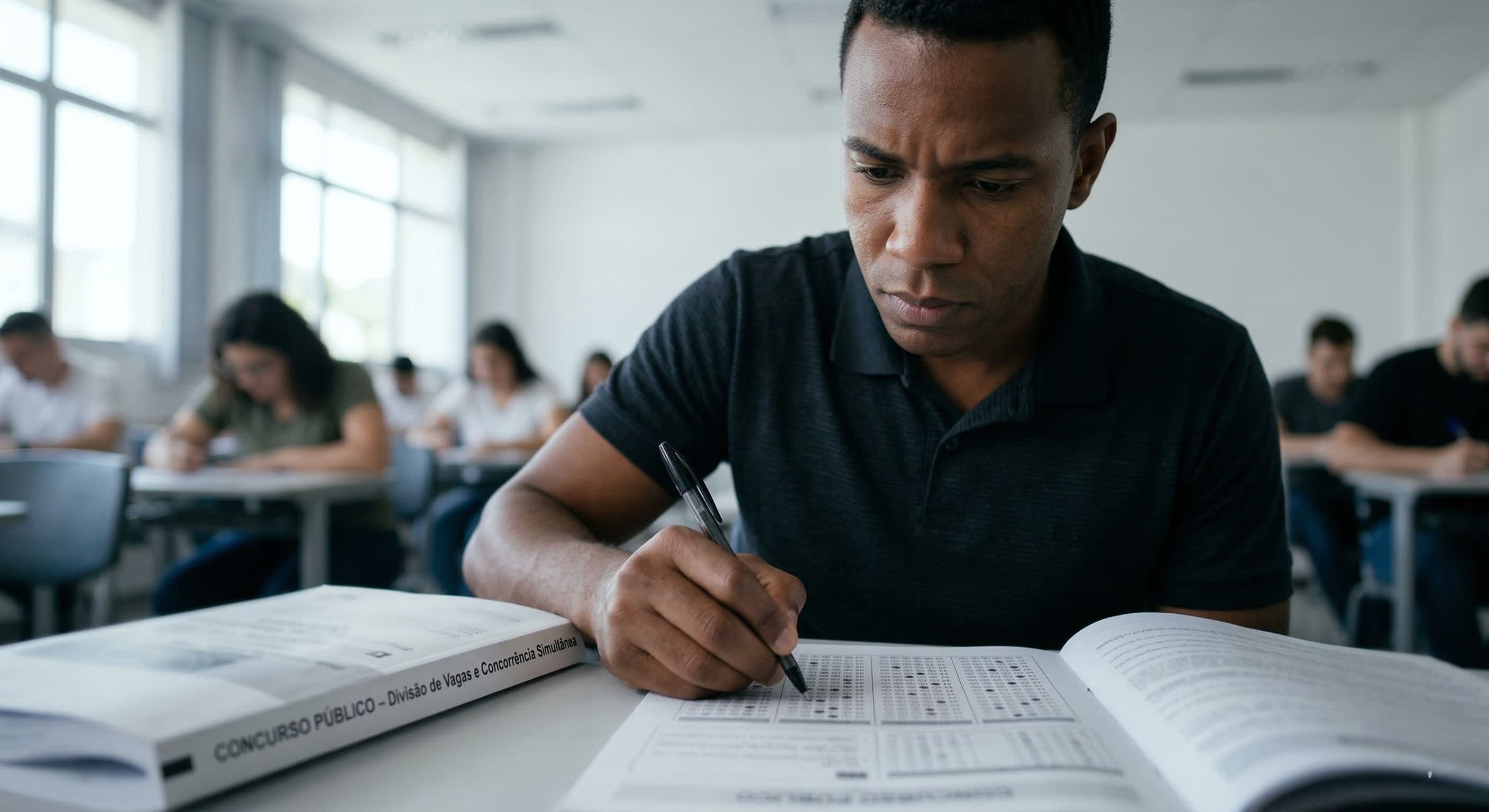 Alt Text: Ilustração de um candidato focado fazendo uma prova de concurso, representando a concorrência simultânea nas vagas reservadas e de ampla concorrência.
