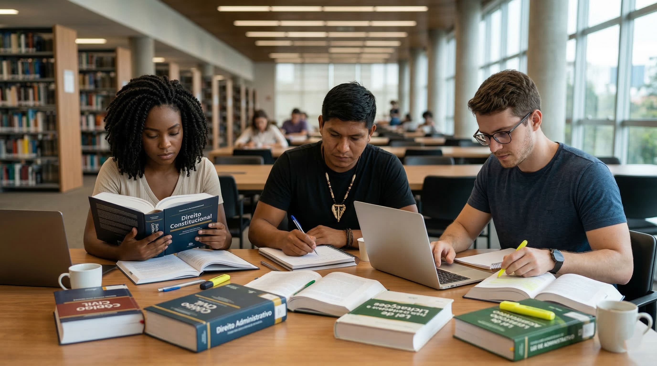 Alt Text: Diversidade de candidatos brasileiros, representando negros, indígenas e brancos, estudando juntos para concursos públicos, simbolizando a nova lei de cotas e a igualdade de oportunidades.