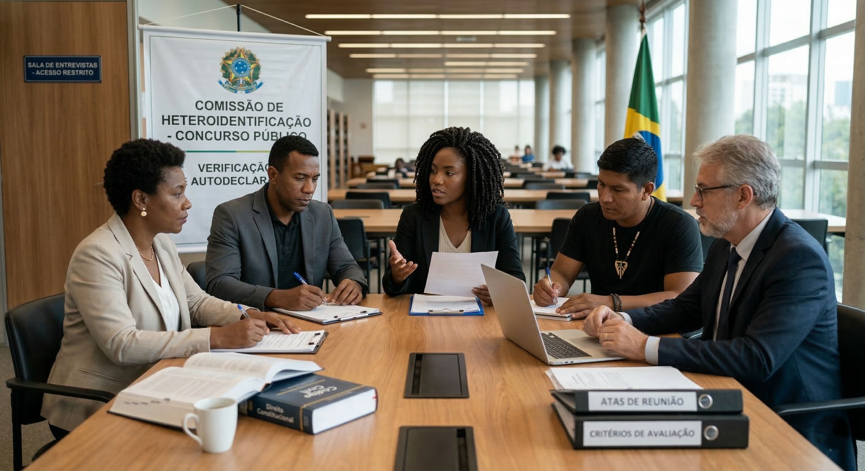 Alt Text: Grupo diversificado de profissionais analisando de forma justa o perfil de um candidato em uma sala de reuniões, representando a comissão de heteroidentificação em concursos públicos.