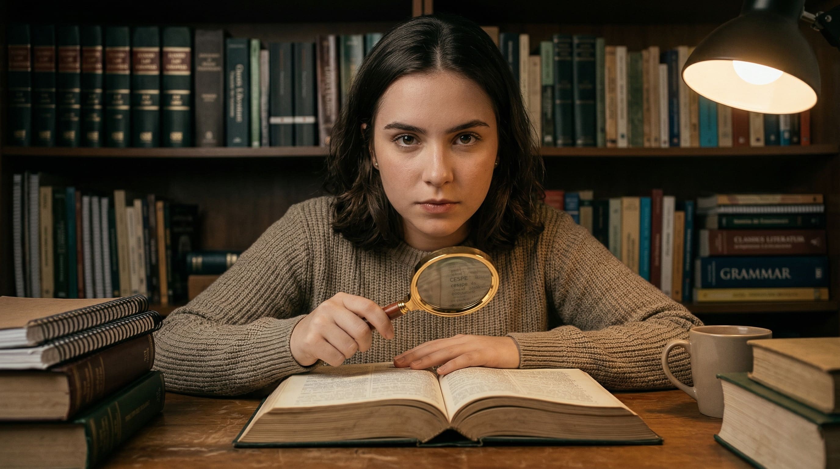 Alt Text: Estudante examinando palavras difíceis em livros para concurso da banca CESPE.