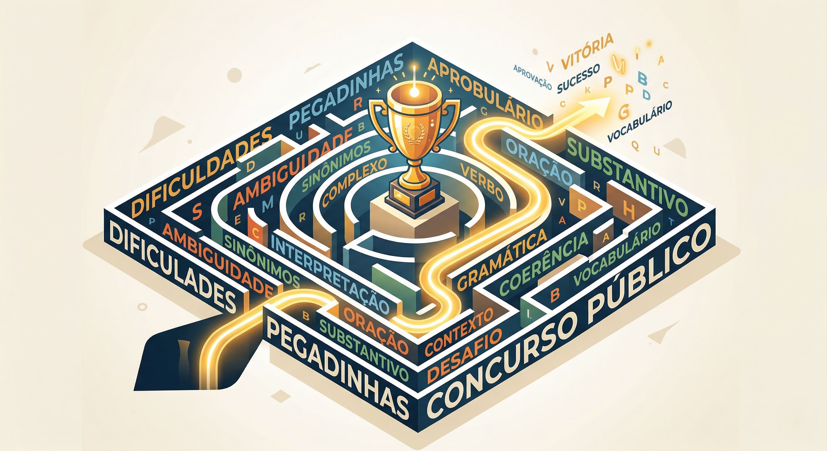 Alt Text: Labirinto de palavras ilustrando as pegadinhas de vocabulário nas provas de concurso.