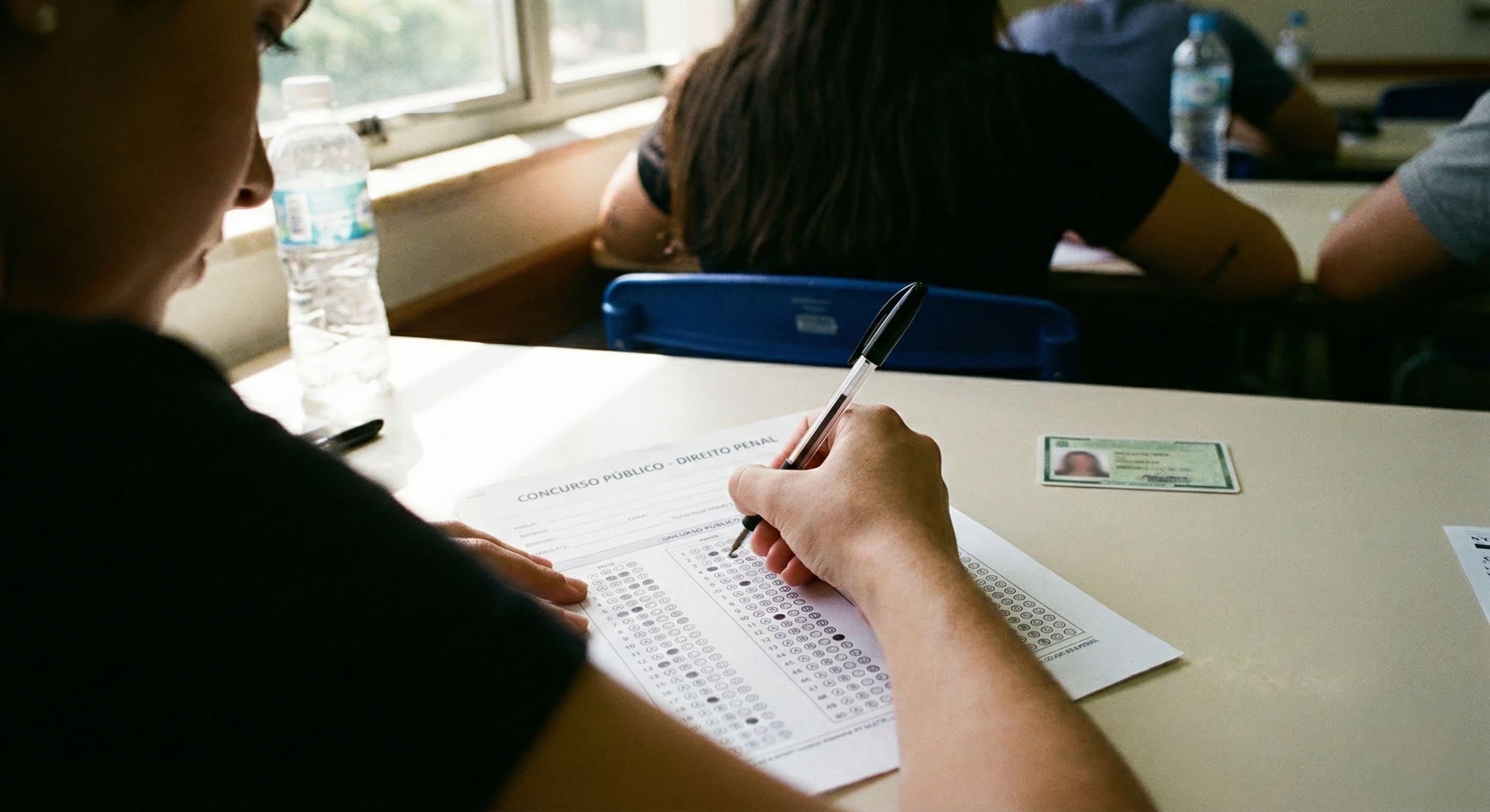 Alt Text: Candidato preenchendo gabarito de prova de Direito Penal, aplicando conhecimentos sobre infrações e crimes em concurso público estadual.