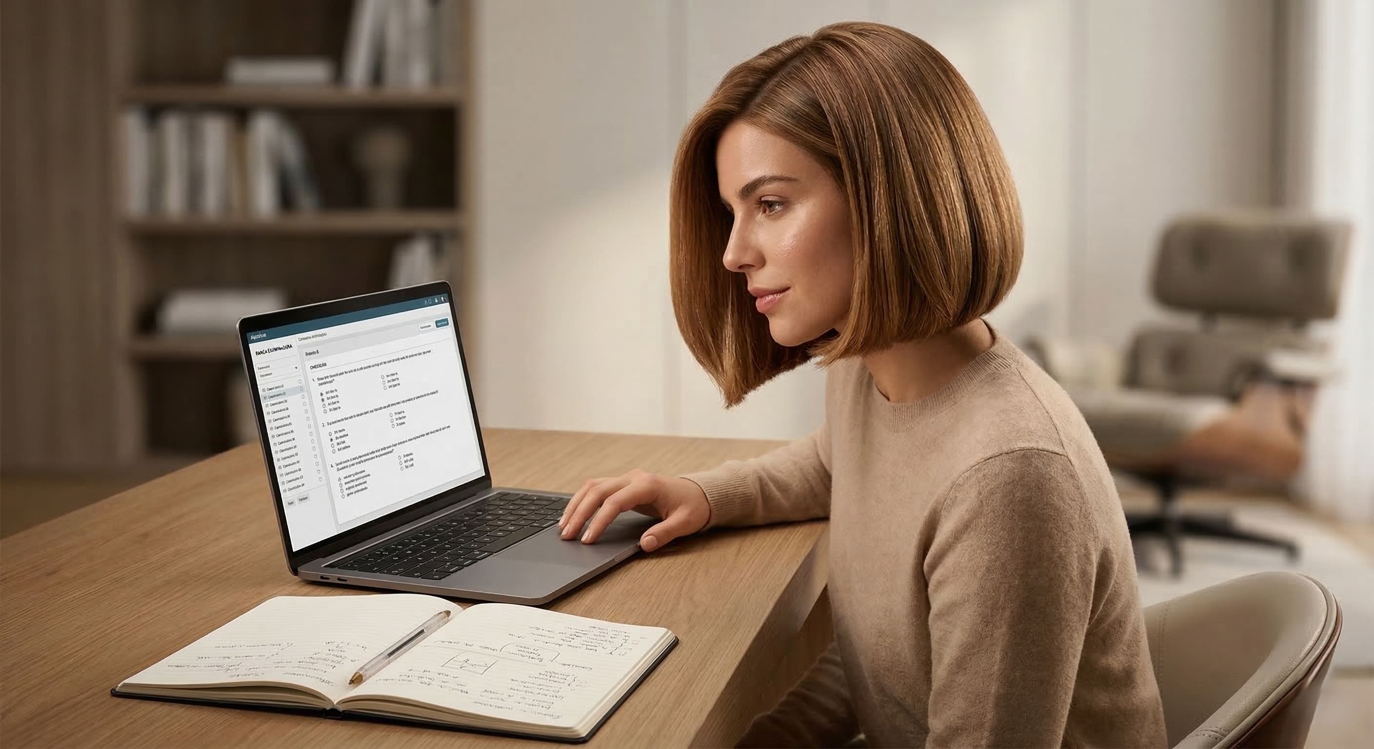 Alt Text: Pessoa focada estudando por questões para concurso público em um ambiente bem iluminado, utilizando notebook e cadernos.