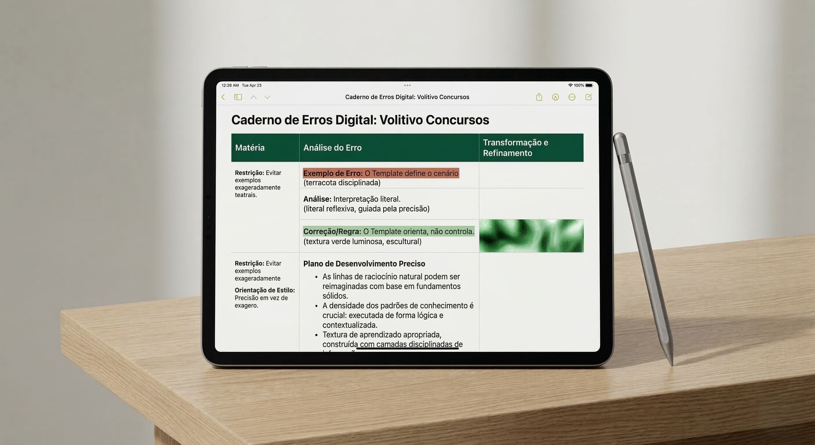 Seja qual for a metodologia escolhida e a banca a ser enfrentada, você precisará de uma ferramenta de controle chamada Caderno de Erros. Ele é o seu fiel escudeiro e a chave para não cometer o mesmo equívoco duas vezes.