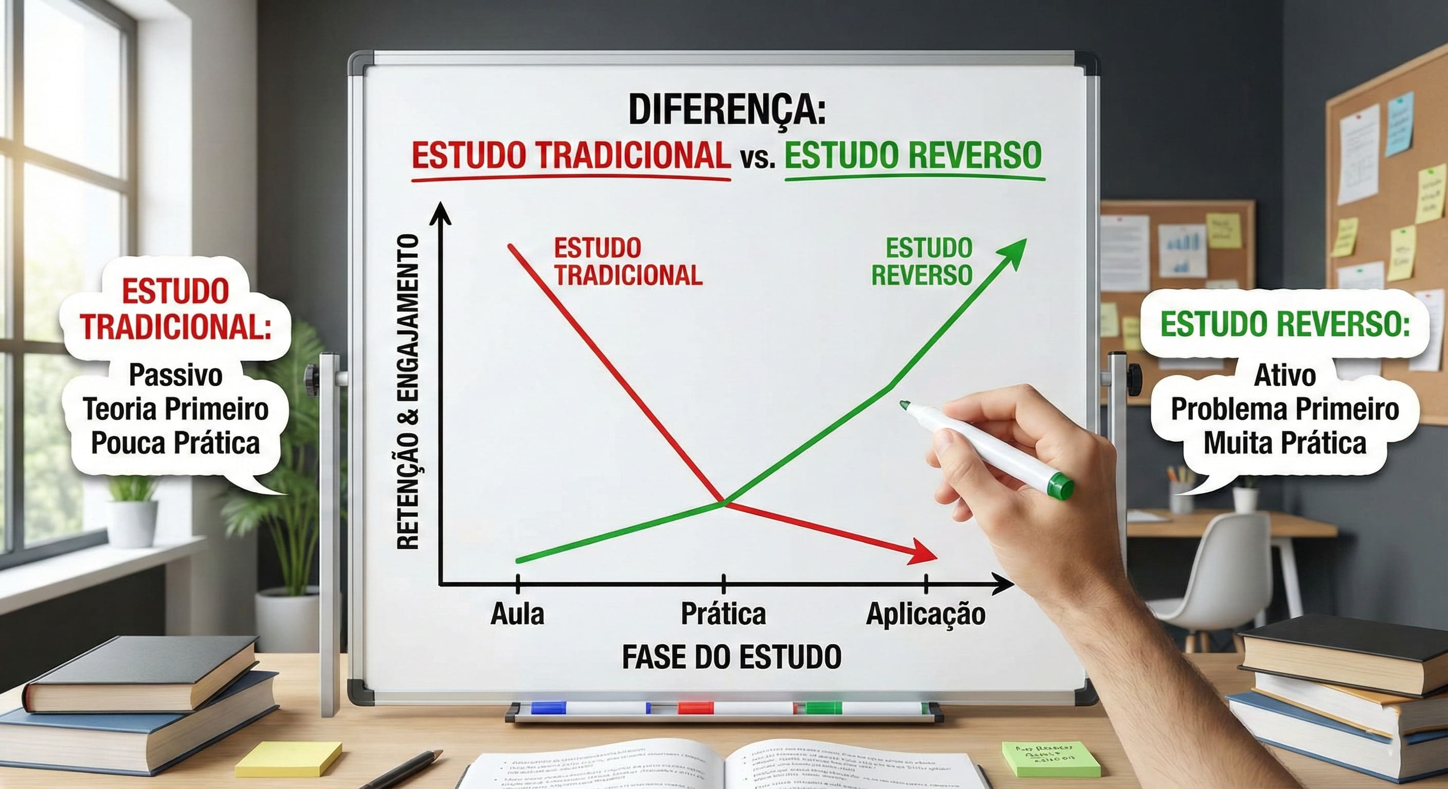É muito confortável grifar textos coloridos e ler passivamente. O estudo reverso tira você da zona de conforto. Ele te obriga a pensar, errar e corrigir. É menos agradável, mas muito mais eficiente. Você para de perder tempo com leituras genéricas que nunca caem.