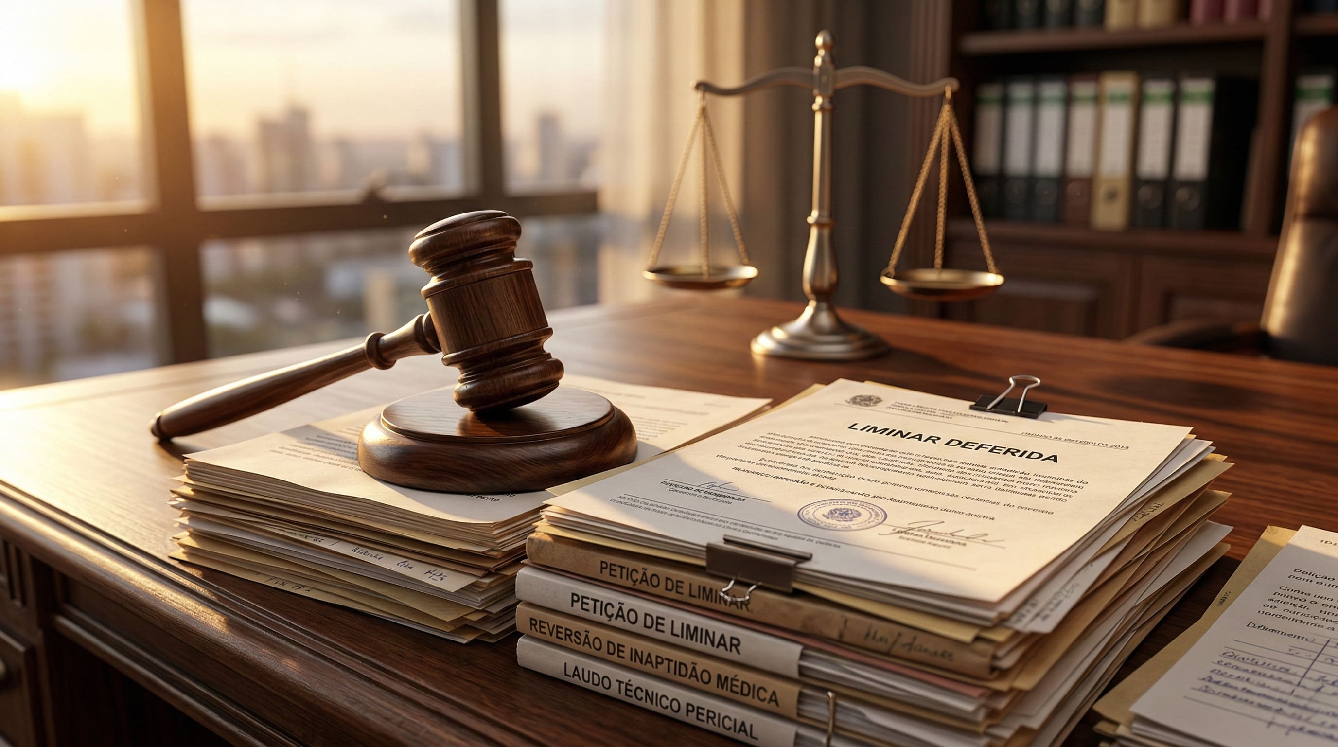 Alt Text: Martelo de juiz sobre documentos legais e médicos, representando a conquista de liminar na Justiça para reversão de inaptidão em concurso público.