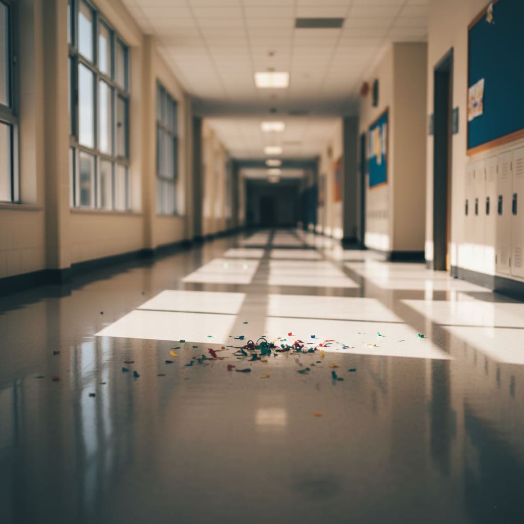 [INSERIR IMAGEM 2: CORREDOR DE ESCOLA COM CONFETES]