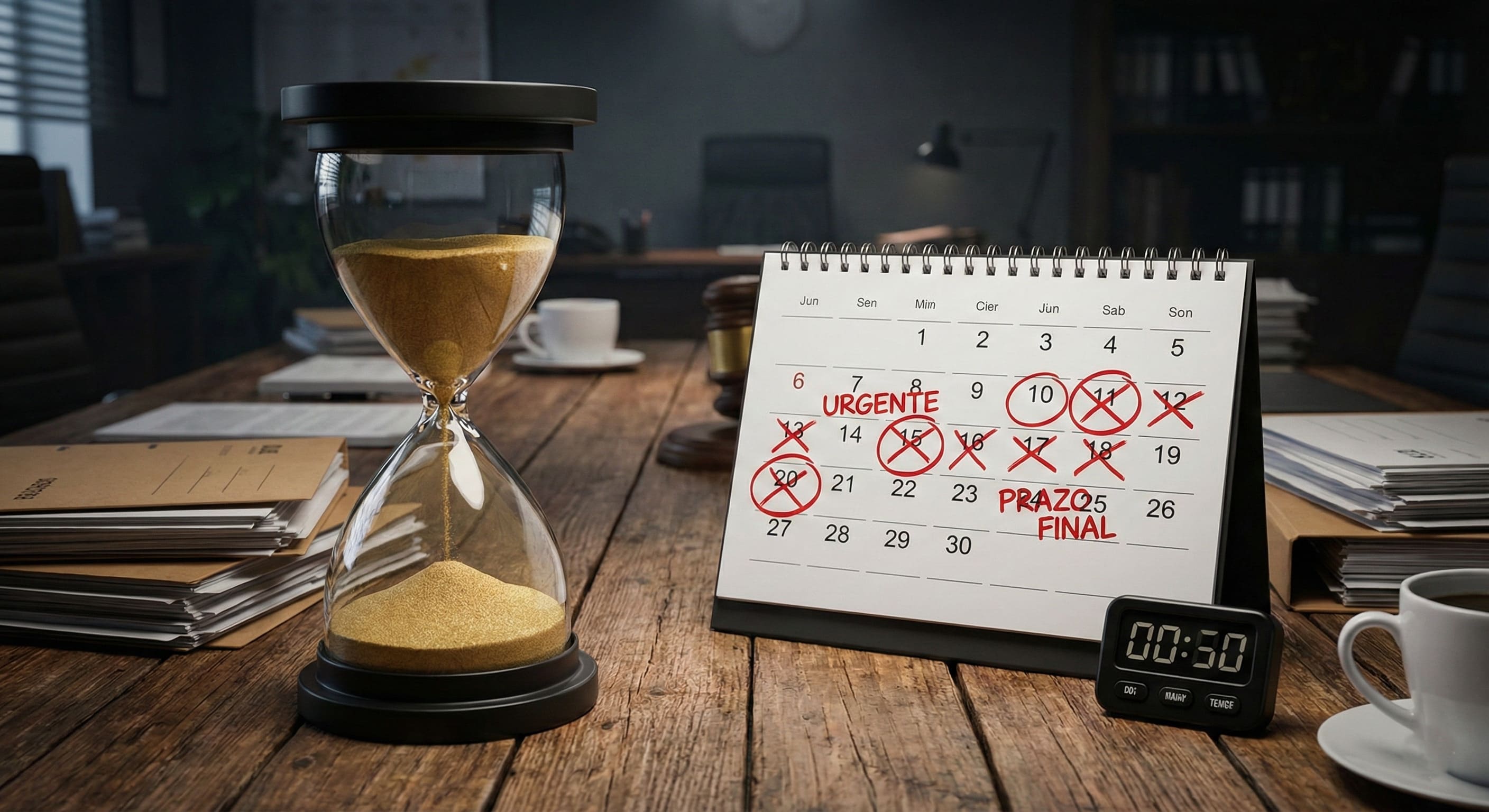 • Alt Text: Ampulheta e calendário marcando a passagem do tempo, ilustrando os novos prazos prescricionais de 8 anos e a prescrição intercorrente.