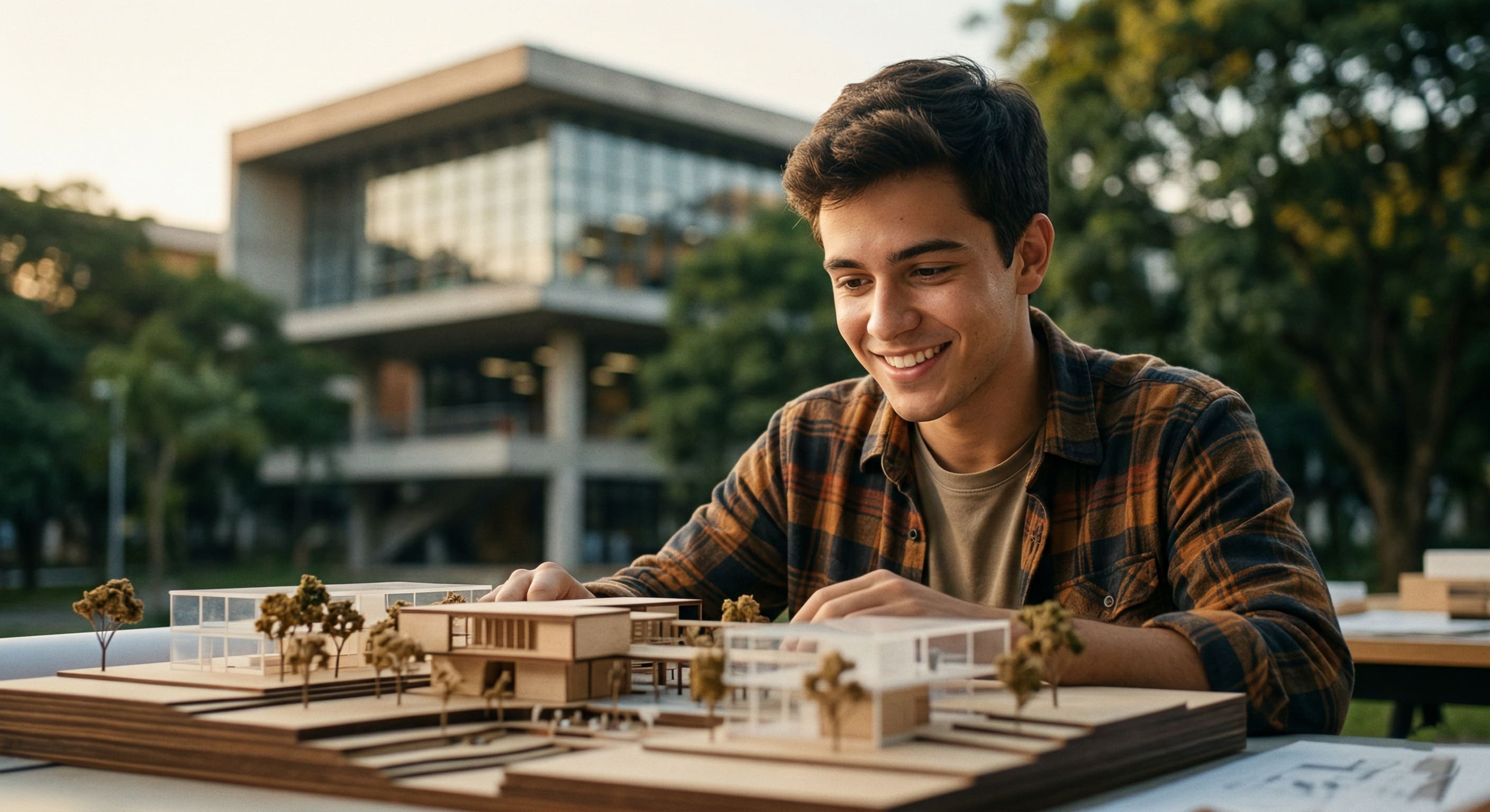 Alt Text: Estudante de arquitetura feliz observando uma maquete, simbolizando a conquista da aprovação e a superação das notas de corte Arquitetura USP.