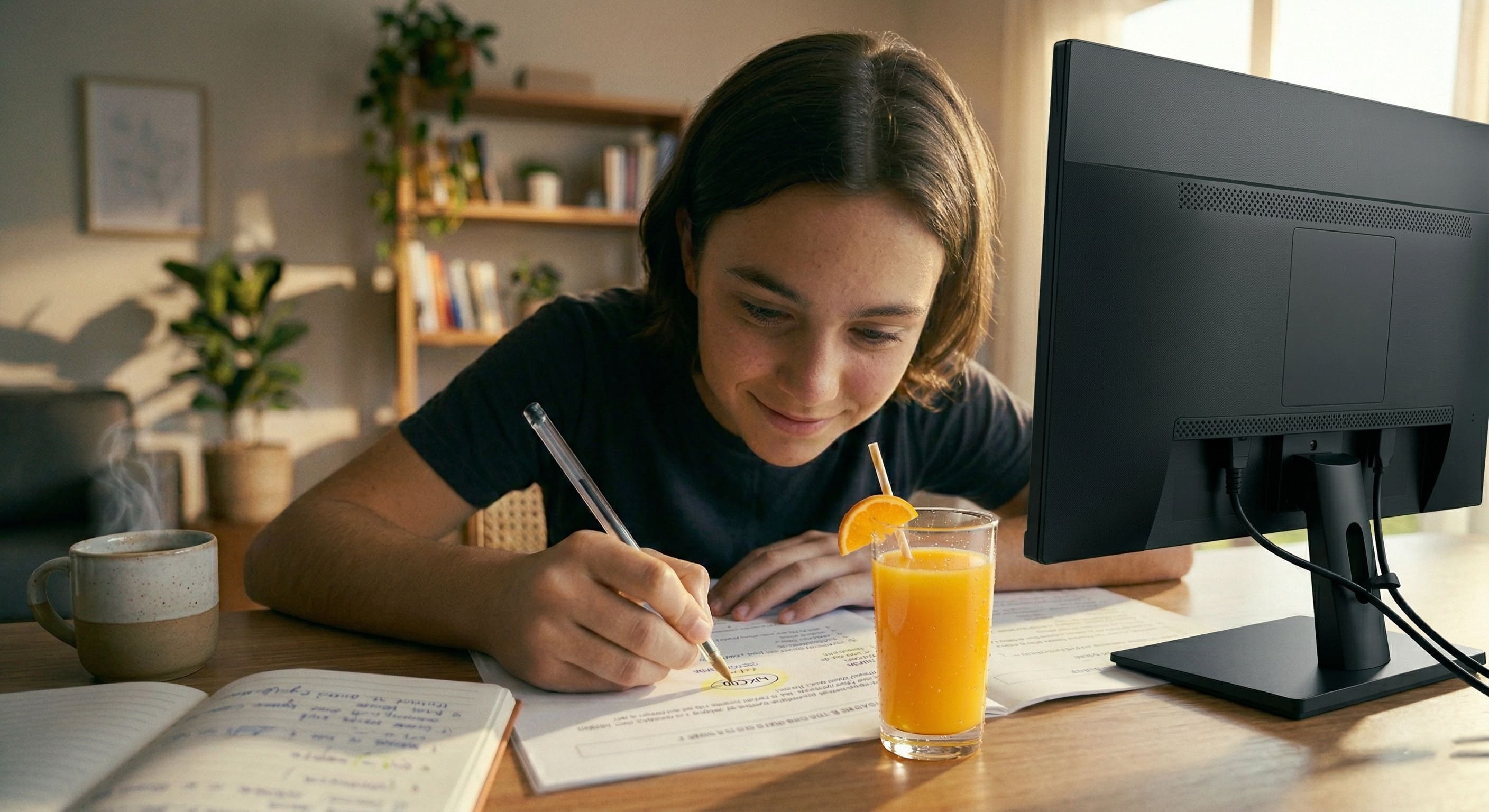 Alt Text: "Pessoa estudando em casa, aplicando técnicas de resolução de questões de múltipla escolha para concursos públicos."