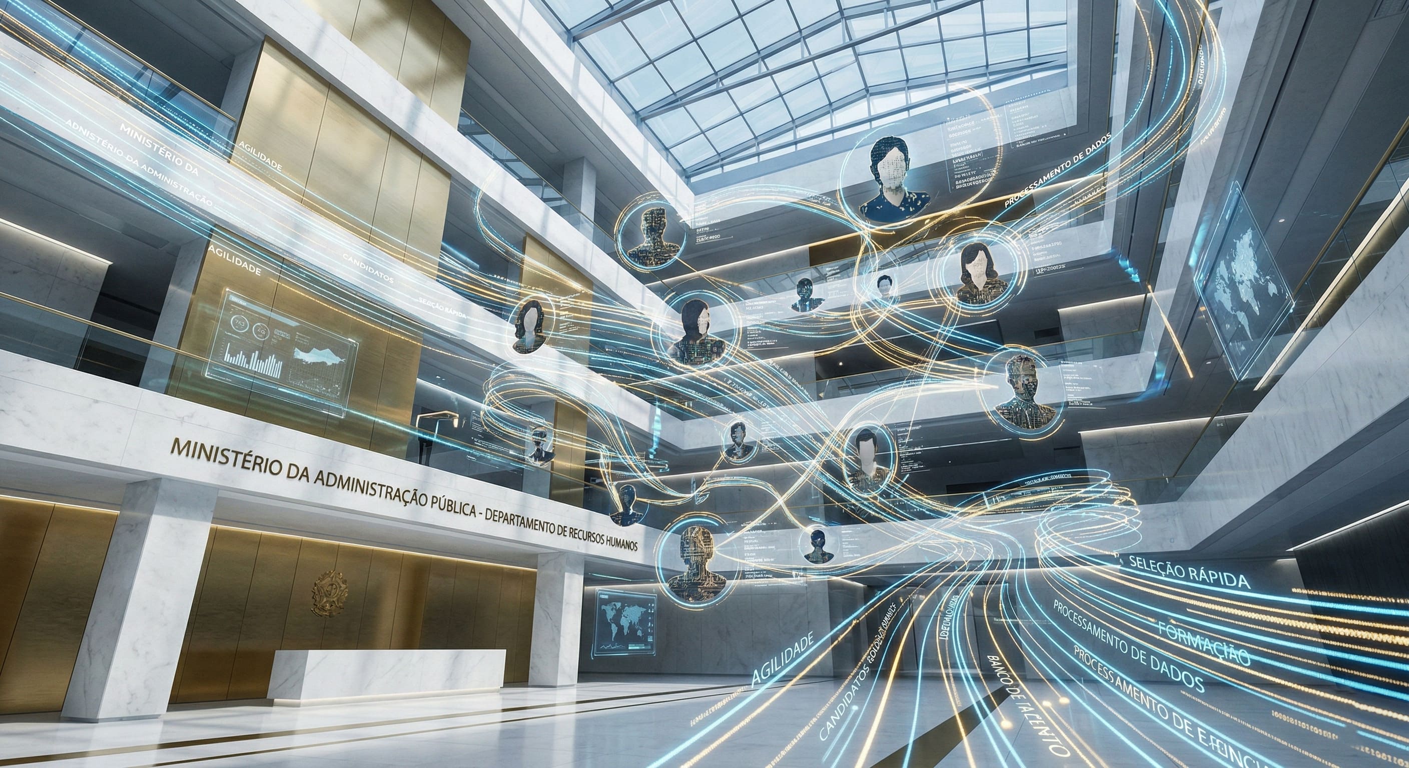 Alt Text: Ilustração abstrata e moderna conectando perfis digitais, representando a agilidade e o banco de talentos propostos por novos modelos de concursos públicos.