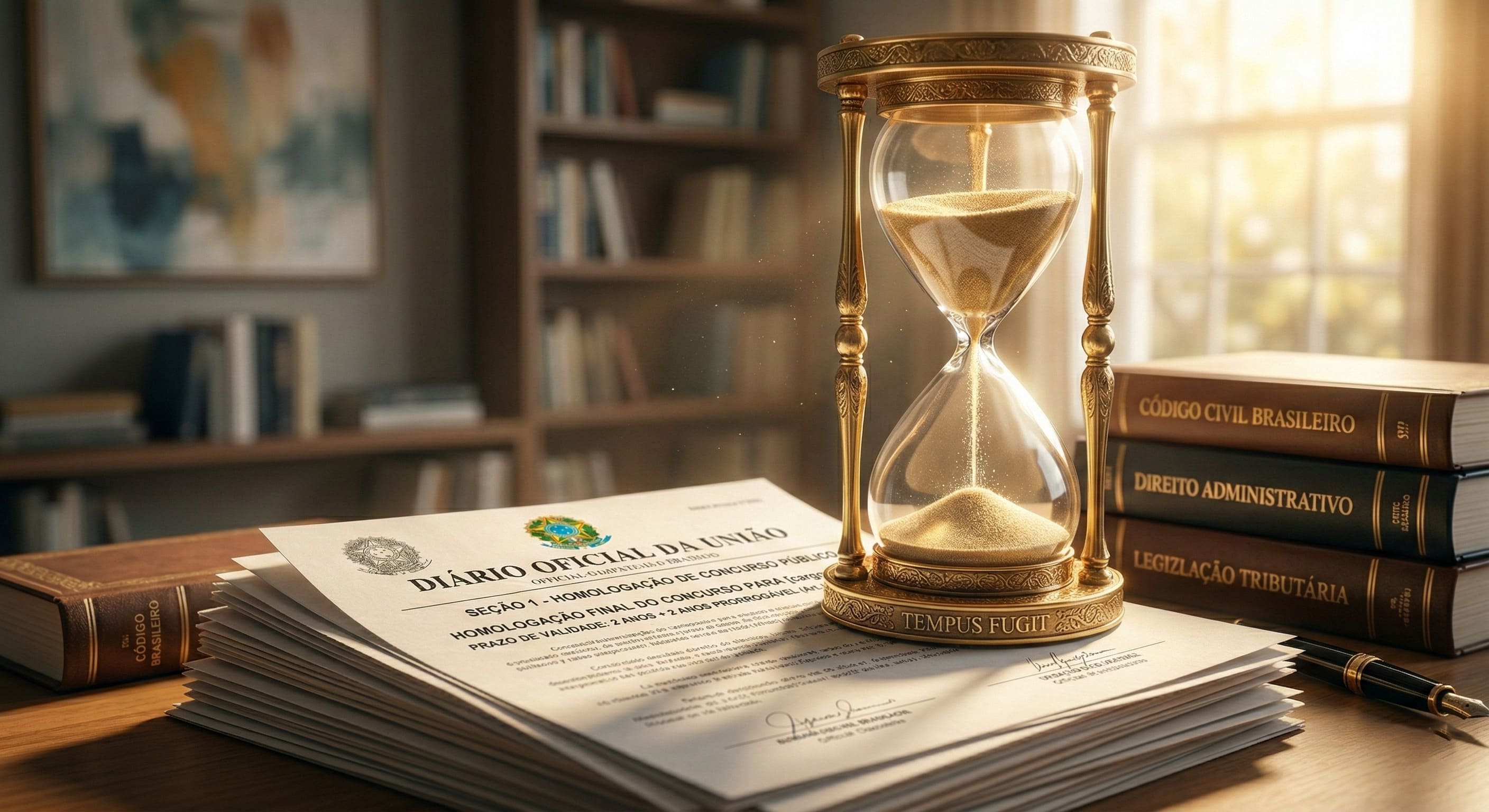 Alt Text: Ampulheta dourada sobre documentos jurídicos, simbolizando o tempo de espera e o prazo de validade de um concurso público após a homologação.
