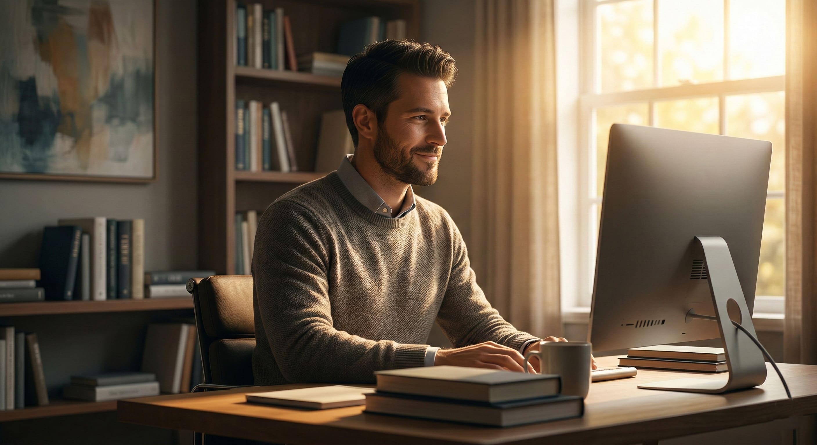 Alt Text: Jovem profissional sorrindo aliviado em frente ao computador após descobrir a homologação do seu concurso público, representando a vitória e o início de uma nova fase.