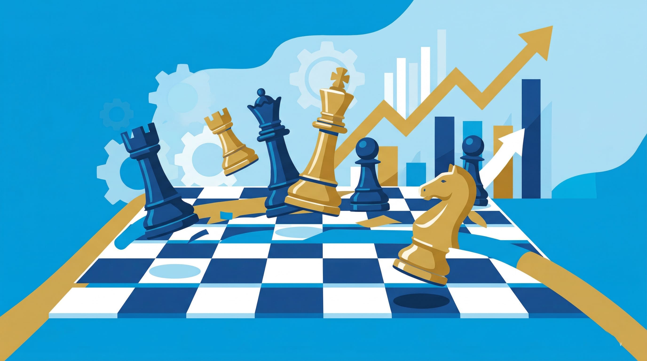 Alt Text: Ilustração de um tabuleiro de xadrez com gráficos e engrenagens, representando as estratégias e as forças competitivas de Michael Porter aplicadas ao mundo dos negócios.