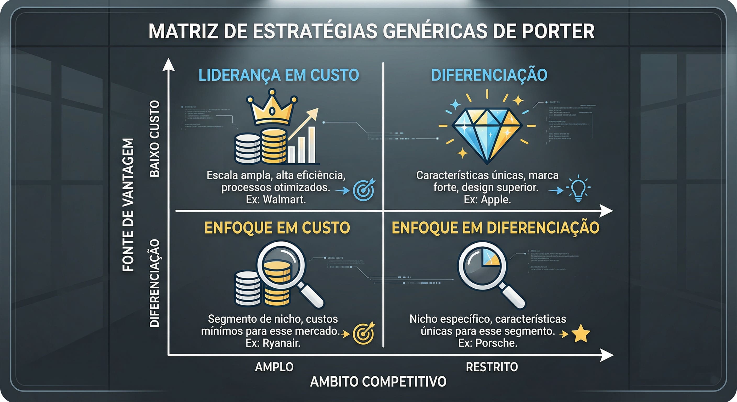 Alt Text: Representação gráfica da matriz destacando liderança em custos, diferenciação e estratégia de enfoque com ícones ilustrativos em quadrantes.