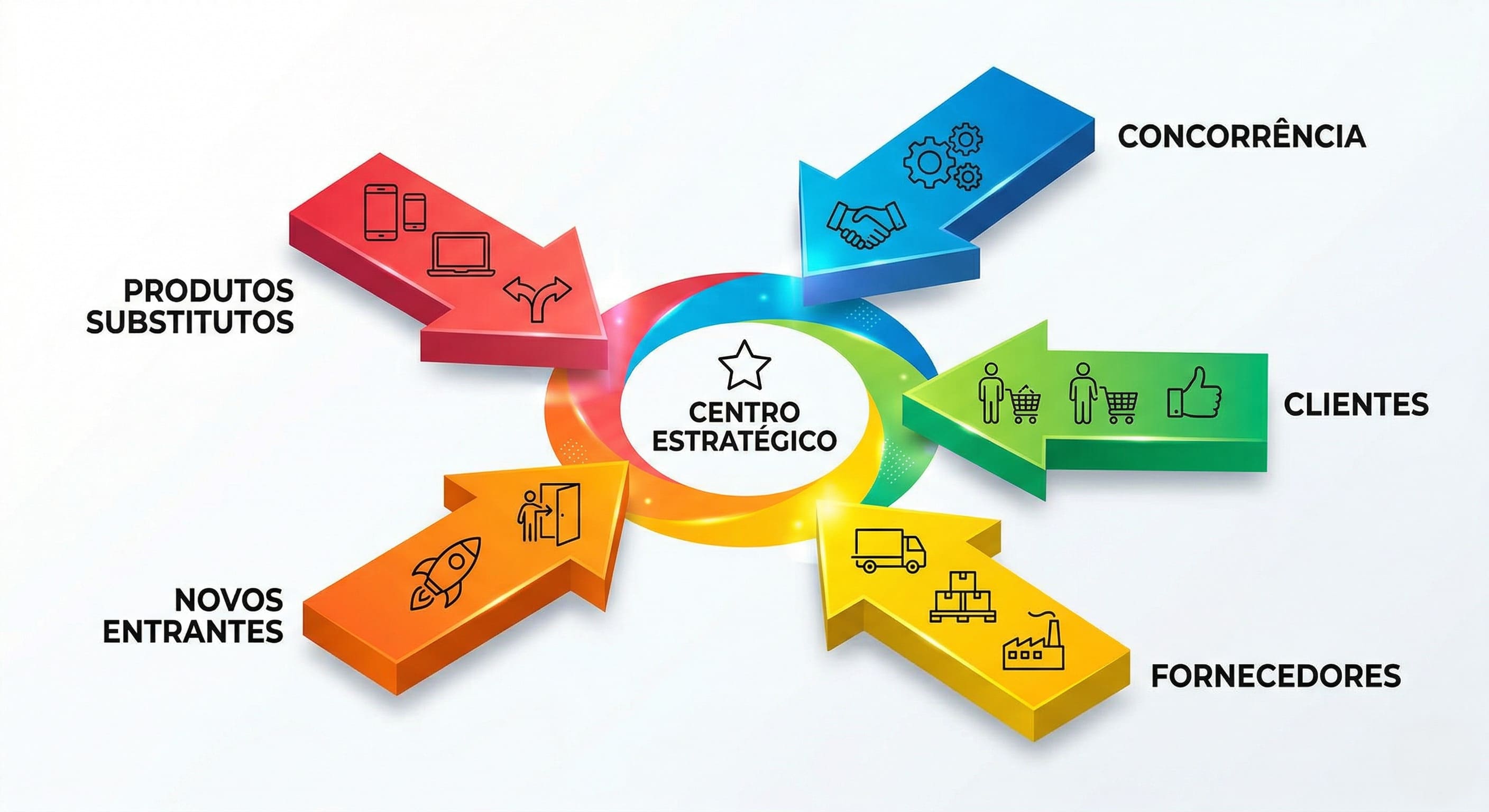 Alt Text: Infográfico detalhado mostrando as cinco forças competitivas convergindo para o centro: poder dos fornecedores, poder dos clientes, ameaça de novos entrantes, ameaça de produtos substitutos e rivalidade entre concorrentes.