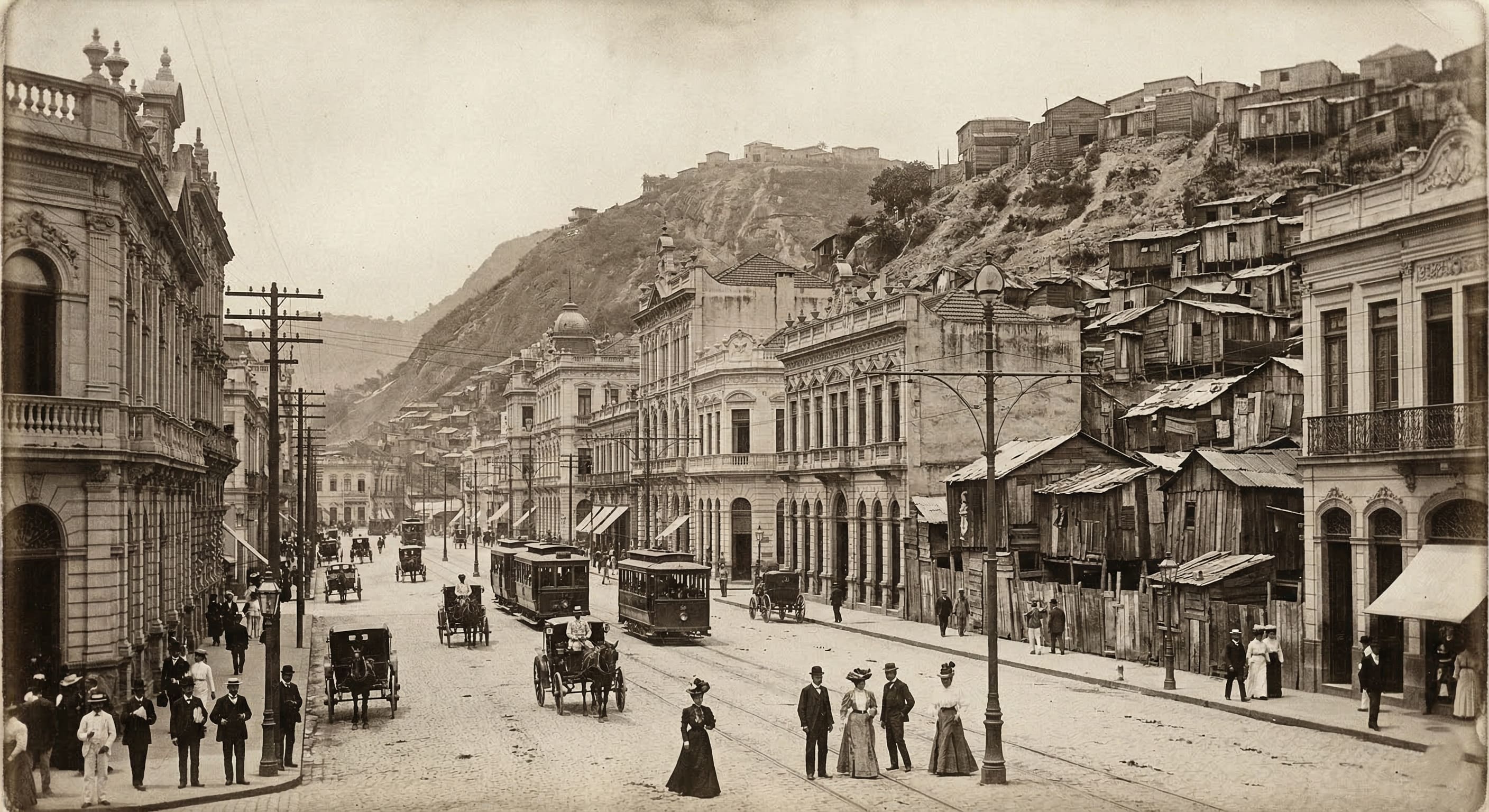 Alt Text (Texto Alternativo): Contraste entre a avenida luxuosa do centro e as casas humildes dos subúrbios no Rio de Janeiro do início do século XX.
