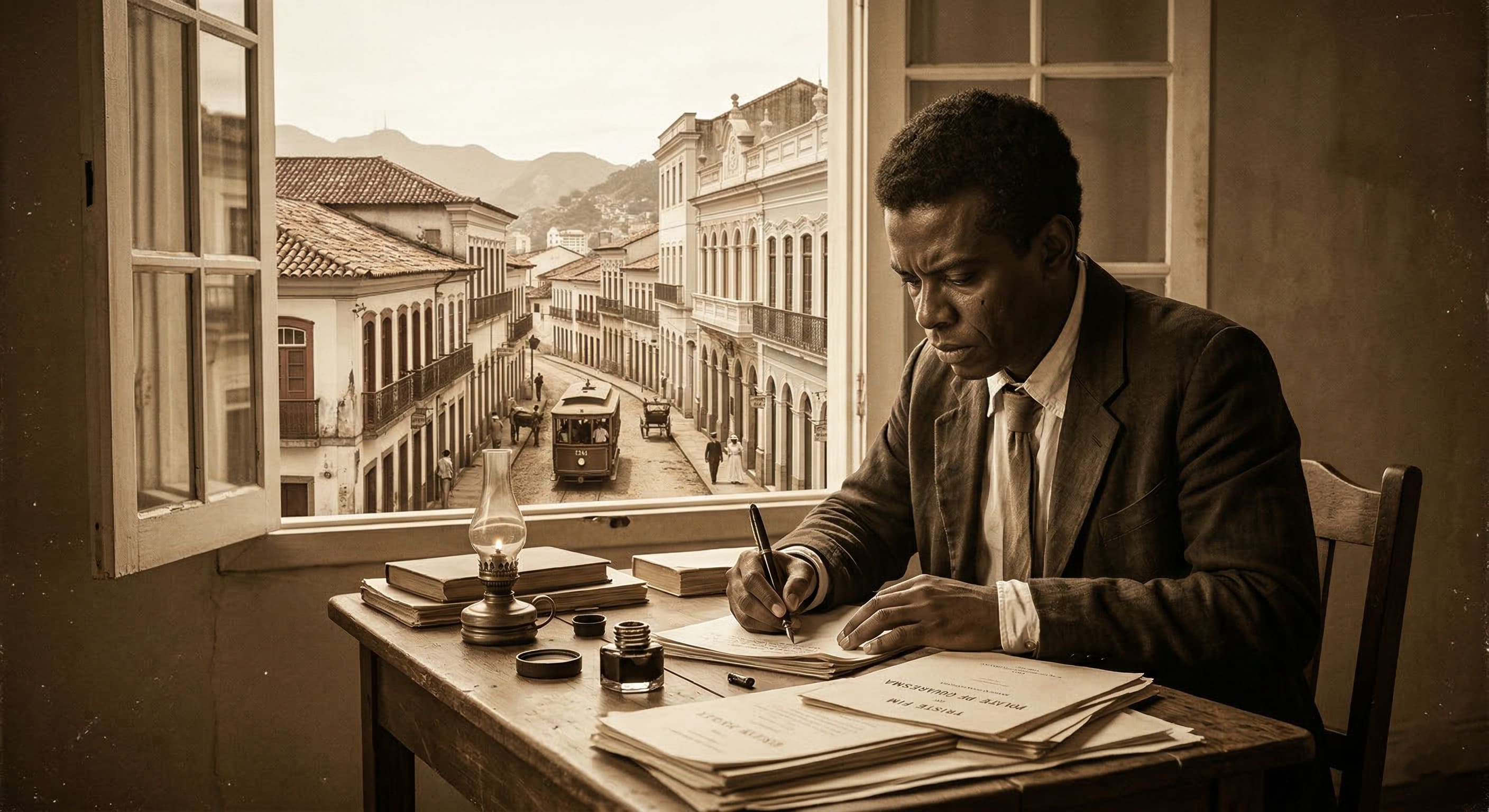 Alt Text (Texto Alternativo): Ilustração de um escritor negro no início do século XX, representando a crítica social em Lima Barreto.