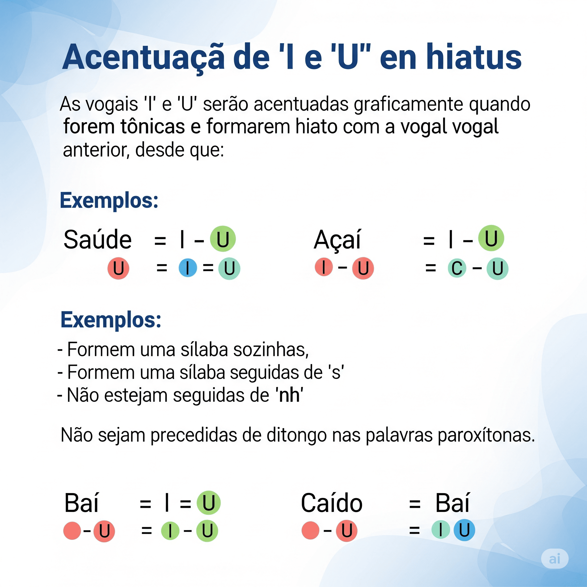 Ficam Sozinhos na Sílaba OU Estão Seguidos de 'S': Esta é a condição crucial. Se o 'I' ou 'U' tônico na sílaba do hiato estiver sozinho ou apenas acompanhado de 's', ele será acentuado.