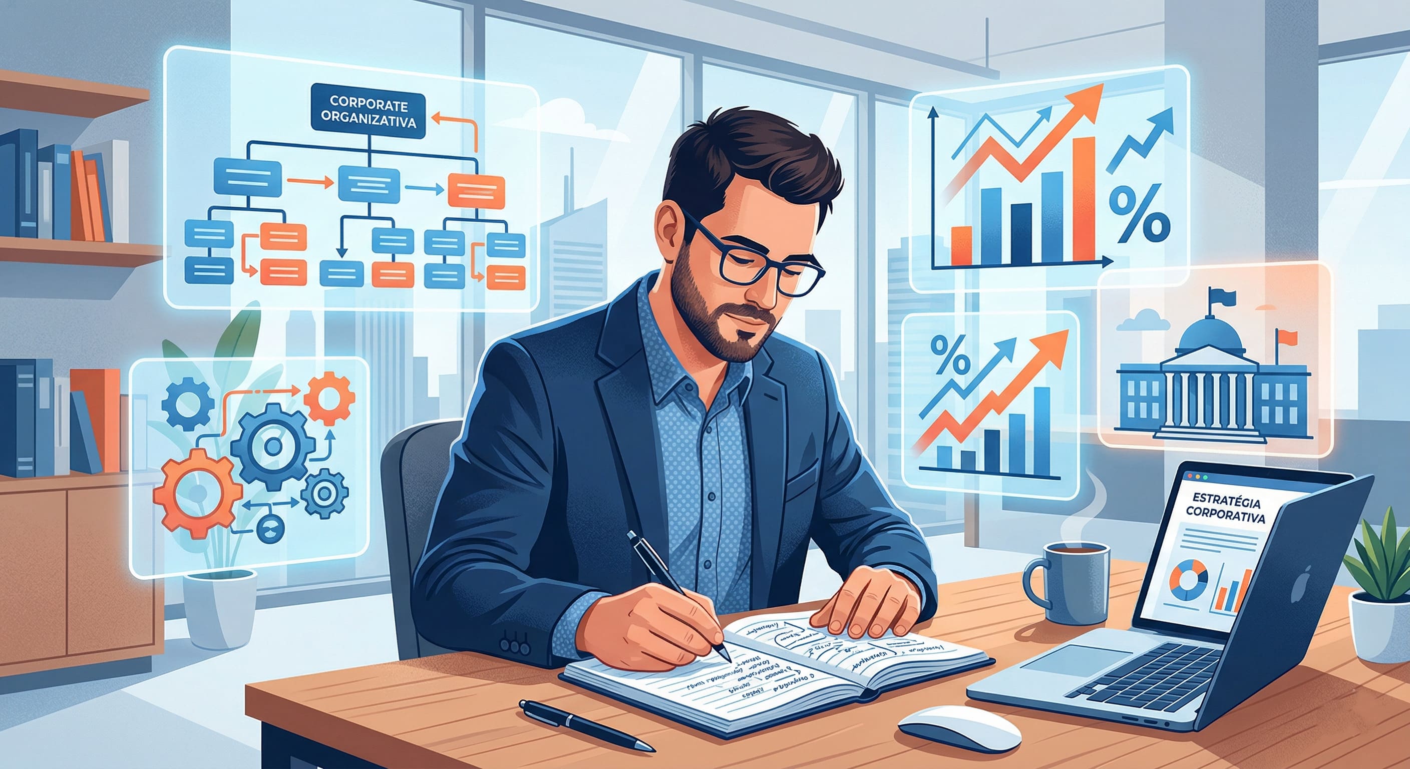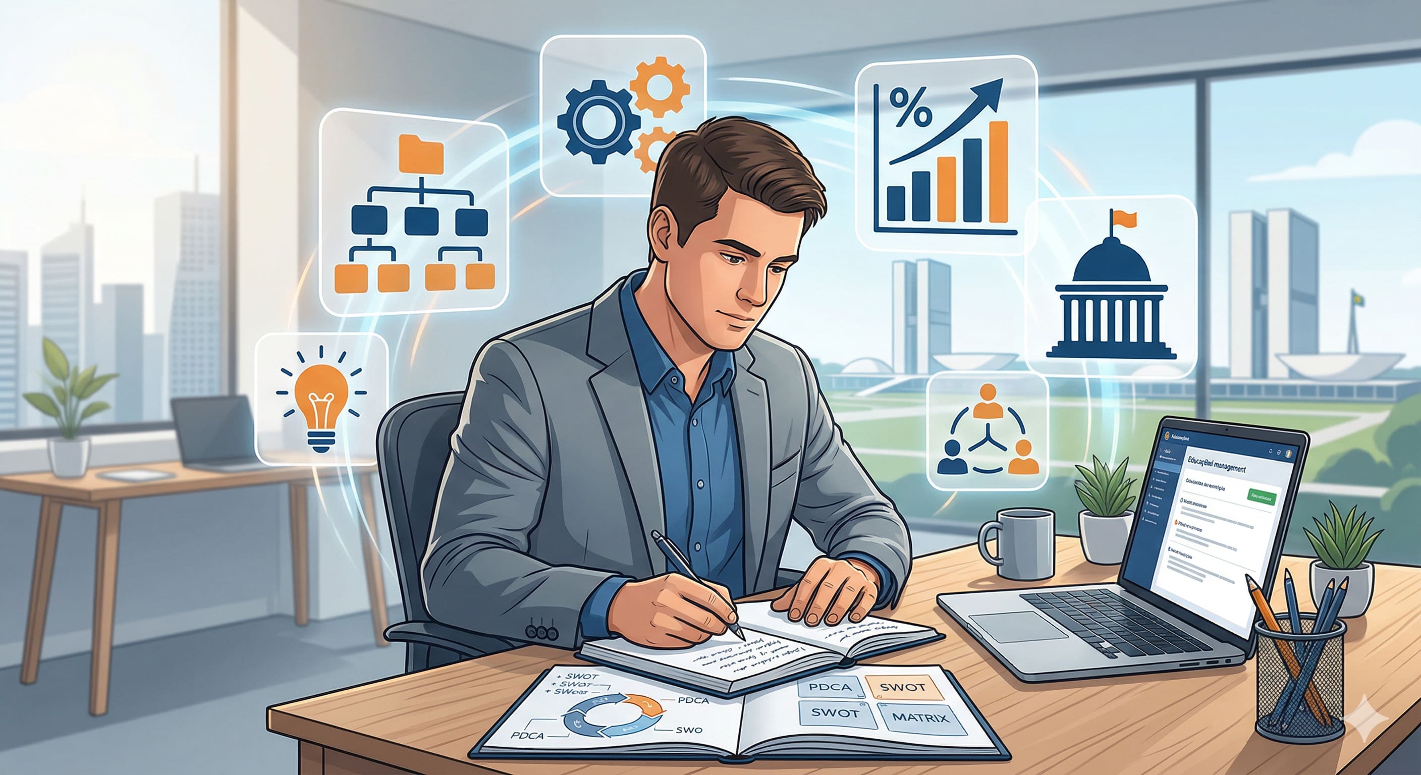 Alt text acessível: Estudante adulto analisando conceitos de Administração para concursos públicos, cercado por representações visuais de organogramas, engrenagens e planejamento estratégico.