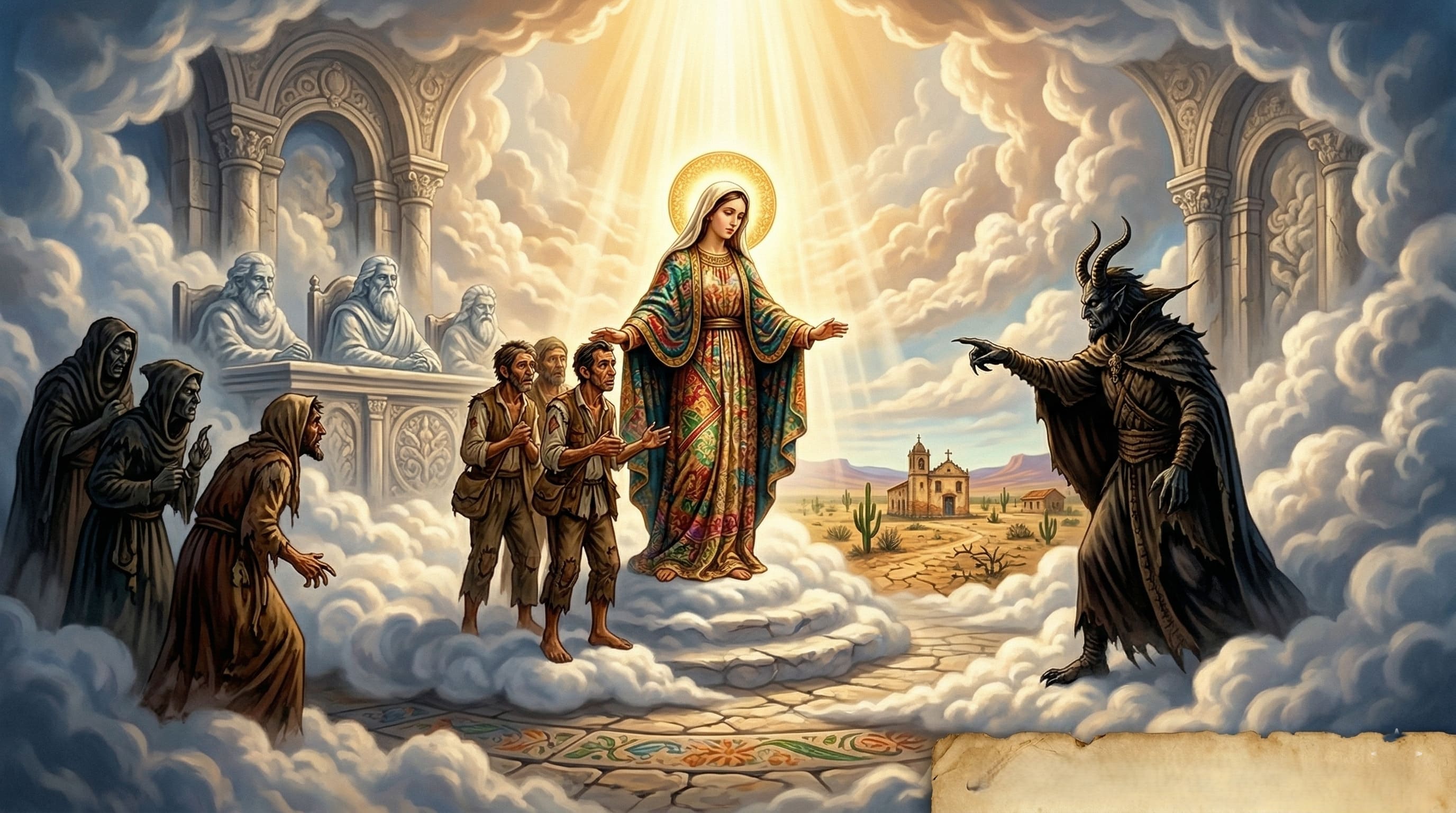 Alt Text: Ilustração de um tribunal celestial com uma figura feminina divina defendendo camponeses contra uma figura sombria, ilustrando o julgamento final.