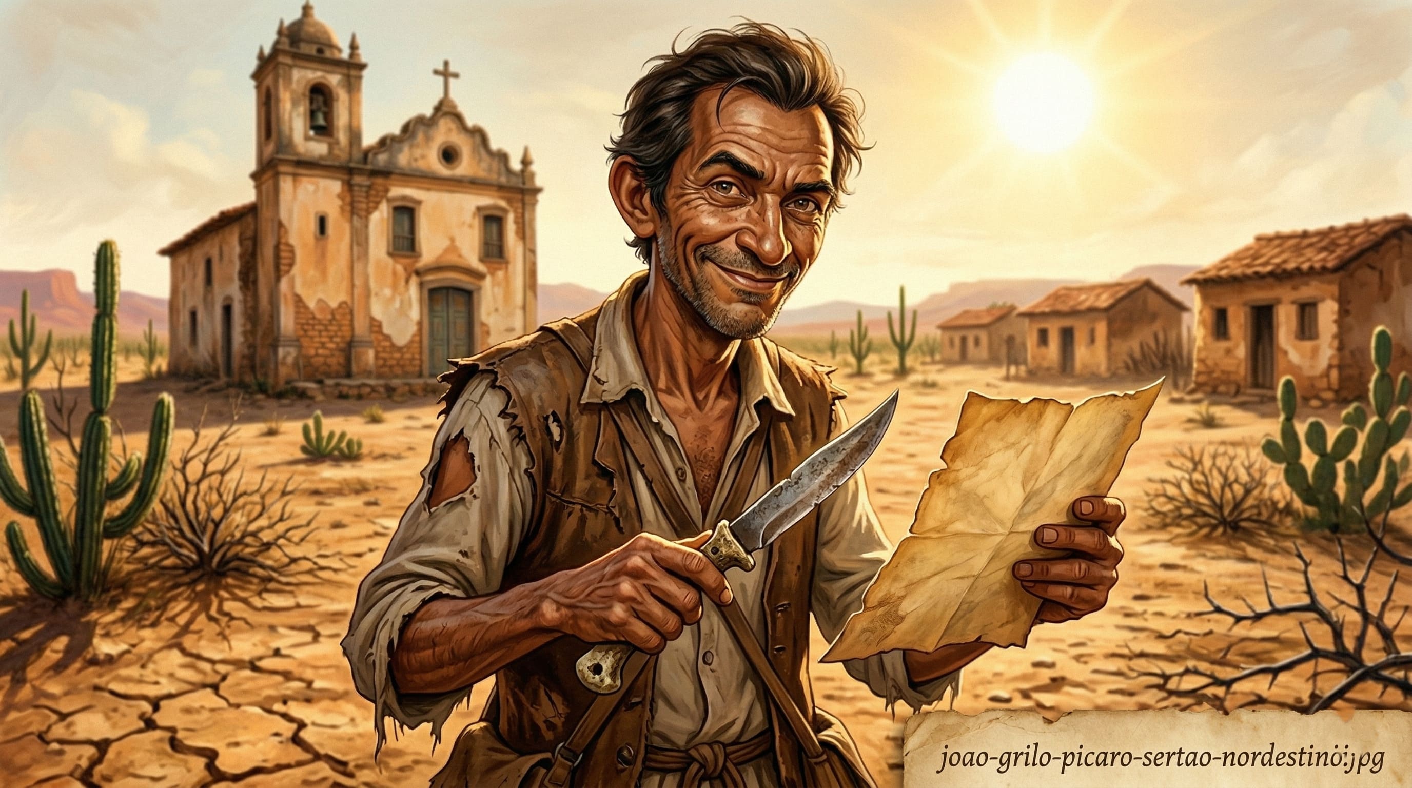 Alt Text: Retrato de um homem nordestino astuto e sorridente segurando um pergaminho, representando a figura do pícaro na literatura.
