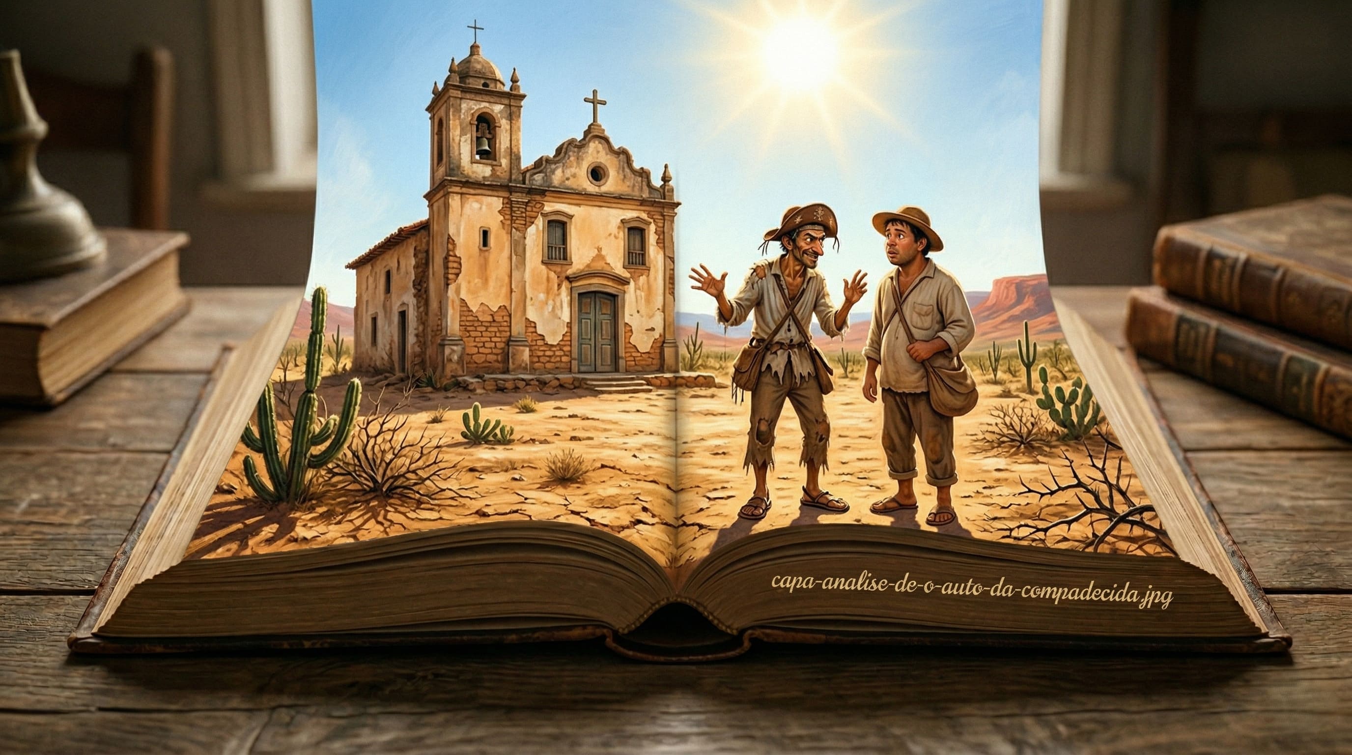 Alt Text: Ilustração digital de dois homens nordestinos no sertão em frente a uma igreja colonial, representando a análise de O Auto da Compadecida.
