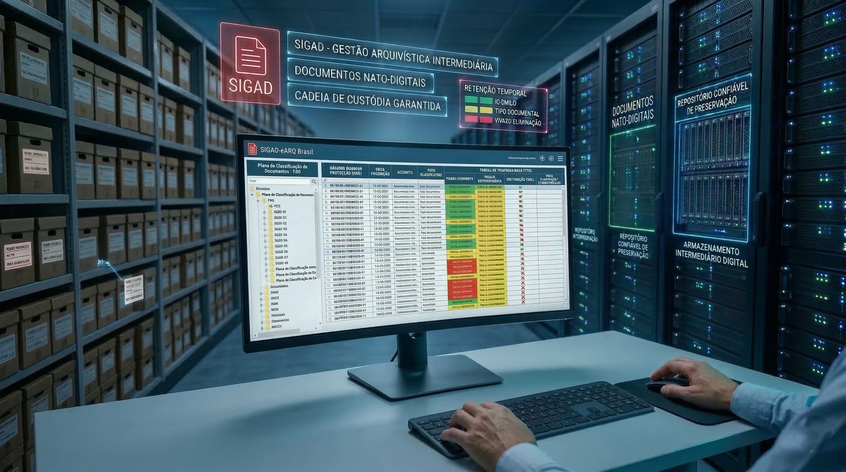 Para os documentos digitais, o controle das idades corrente e intermediária é feito através de um Sistema Informatizado de Gestão Arquivística de Documentos (SIGAD). Esse software complexo captura os documentos e, associado ao plano de classificação e à tabela de temporalidade em seu código, automatiza a contagem dos prazos de retenção.