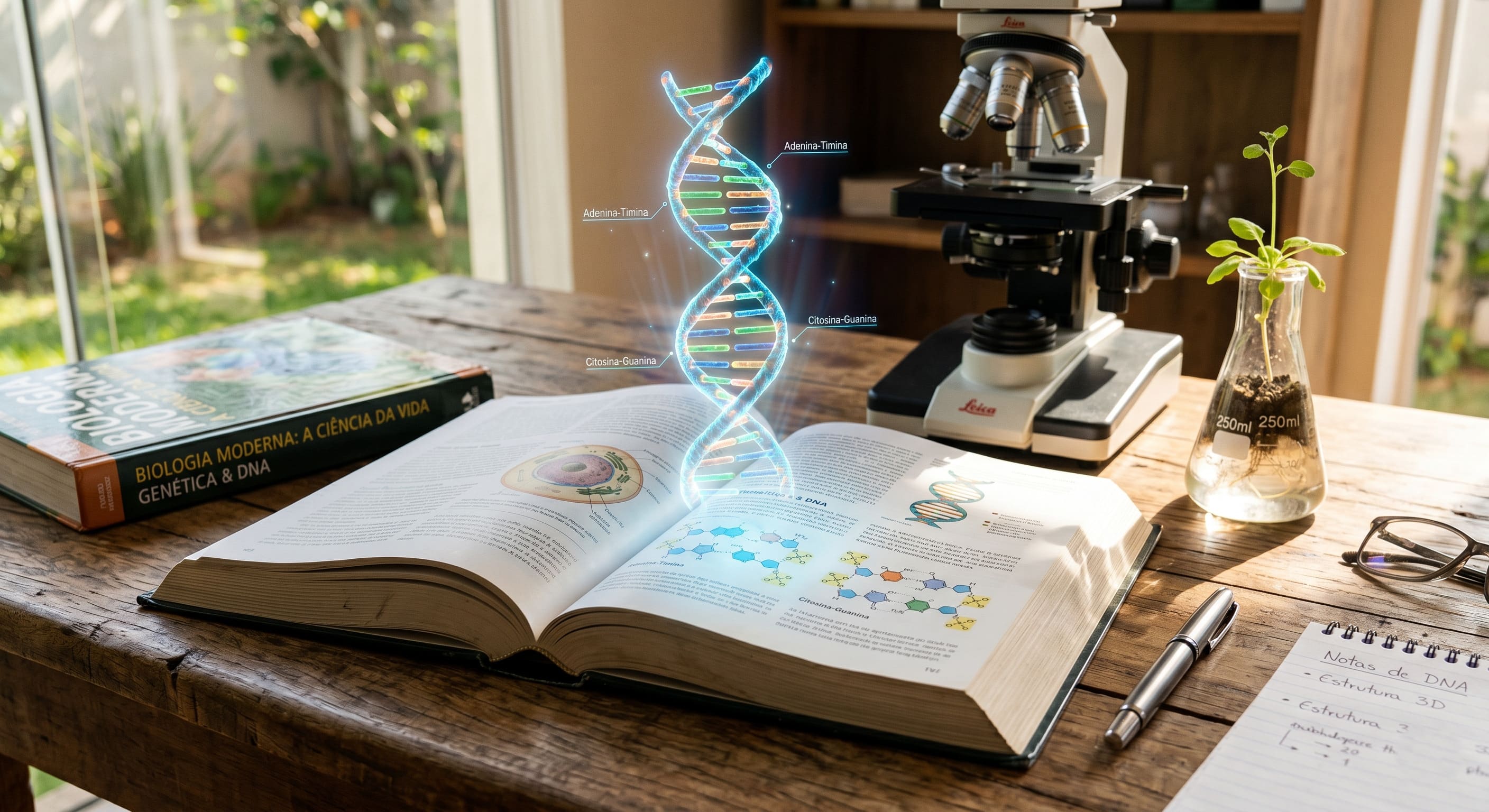 Alt text: Fotografia de uma mesa de estudos contendo um livro aberto de onde emerge uma imagem luminosa de DNA, acompanhado de um microscópio e uma planta em um recipiente de vidro ao fundo.