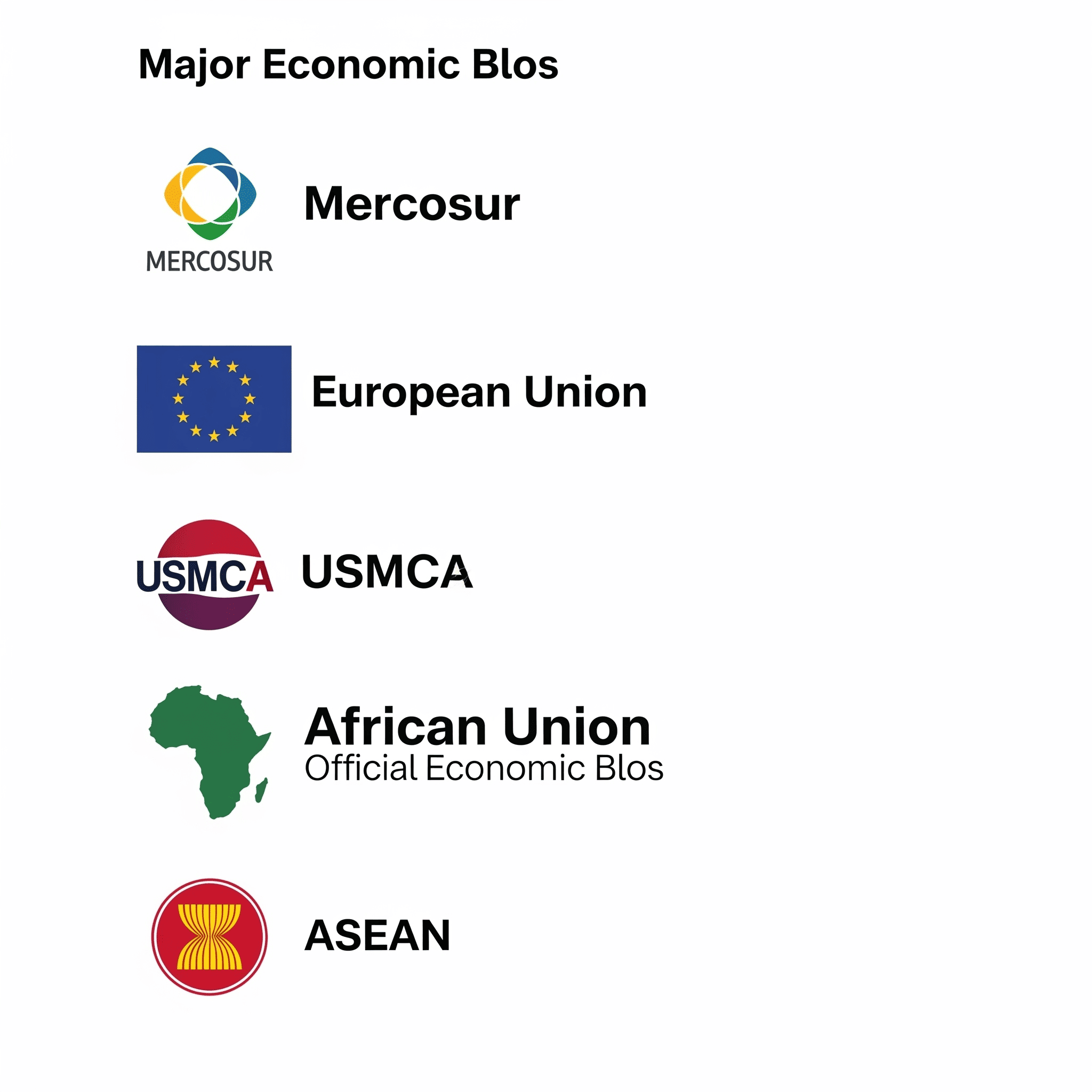 Nível de Integração (e Desafios): Embora seu nome seja "Mercado Comum do Sul", o Mercosul opera, de fato, como uma União Aduaneira, tendo adotado uma Tarifa Externa Comum (TEC) em 1995. Seu grande desafio é consolidar a formação de um verdadeiro mercado comum, com total integração e livre circulação de bens, capitais, serviços e pessoas.