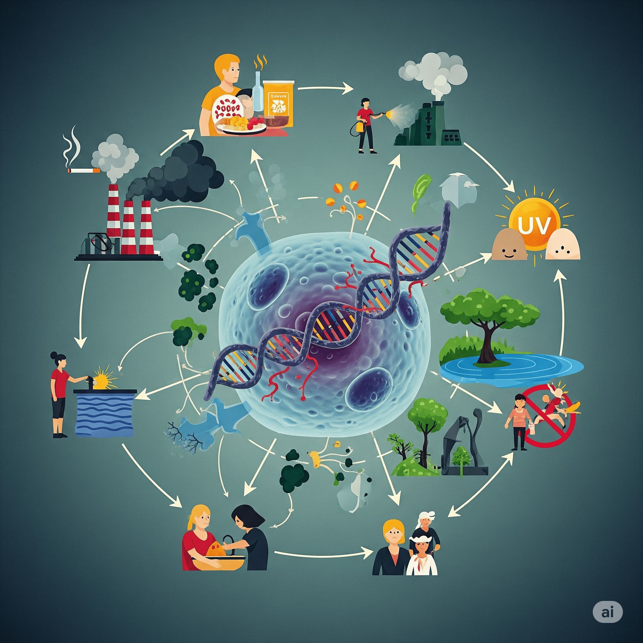 Cerca de 80% dos casos de câncer estão relacionados ao meio ambiente. O conceito de "ambiente" é abrangente, incluindo o meio em geral (água, terra e ar), o ambiente ocupacional (locais de trabalho, como indústrias), o ambiente de consumo (alimentos, medicamentos) e o ambiente sociocultura (estilo e hábitos de vida). A exposição a substâncias carcinogênicas e radiação pode contribuir significativamente para o surgimento da doença.
