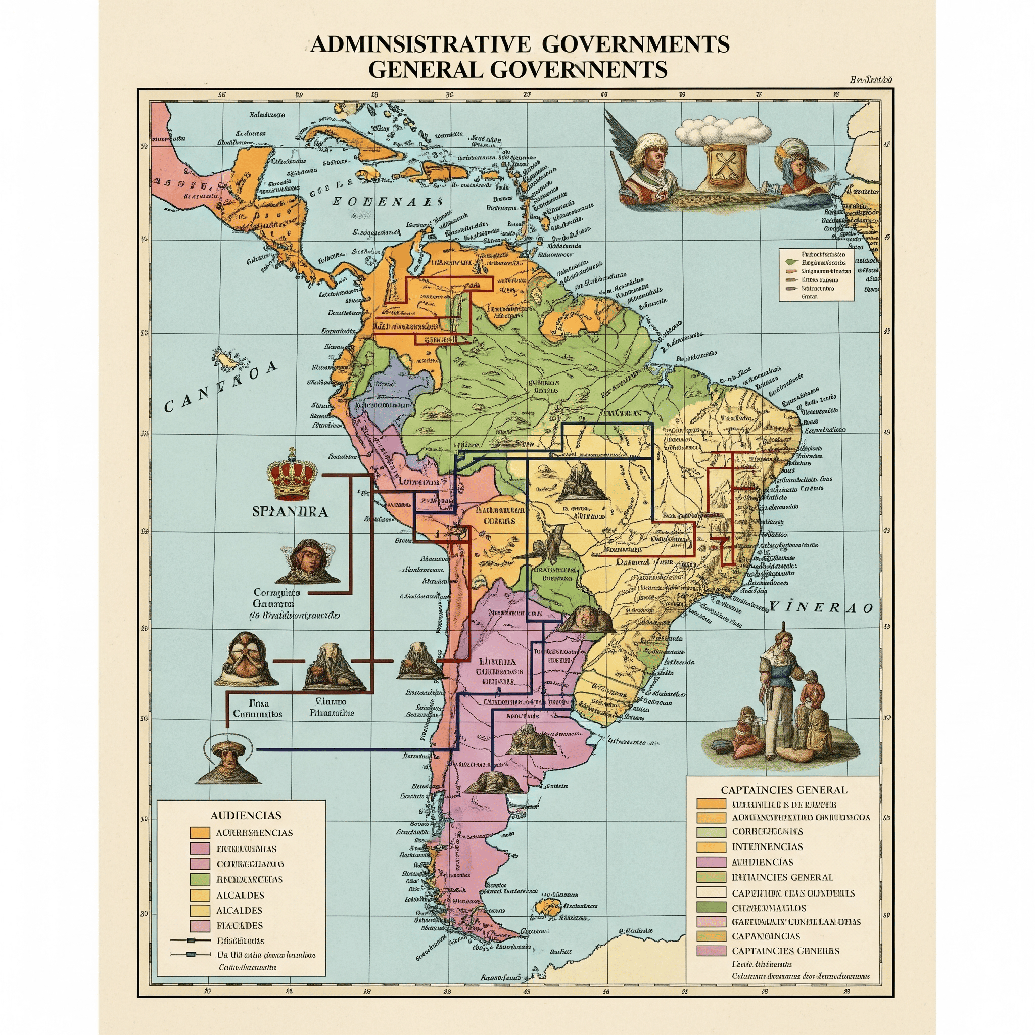 Divisão Territorial: As possessões espanholas foram divididas em quatro grandes Vice-reinados (Nova Espanha, Peru, Nova Granada e Rio da Prata) e quatro Capitanias-Gerais (Cuba, Guatemala, Chile e Venezuela). Os vice-reis e capitães-generais eram nomeados pela Coroa.