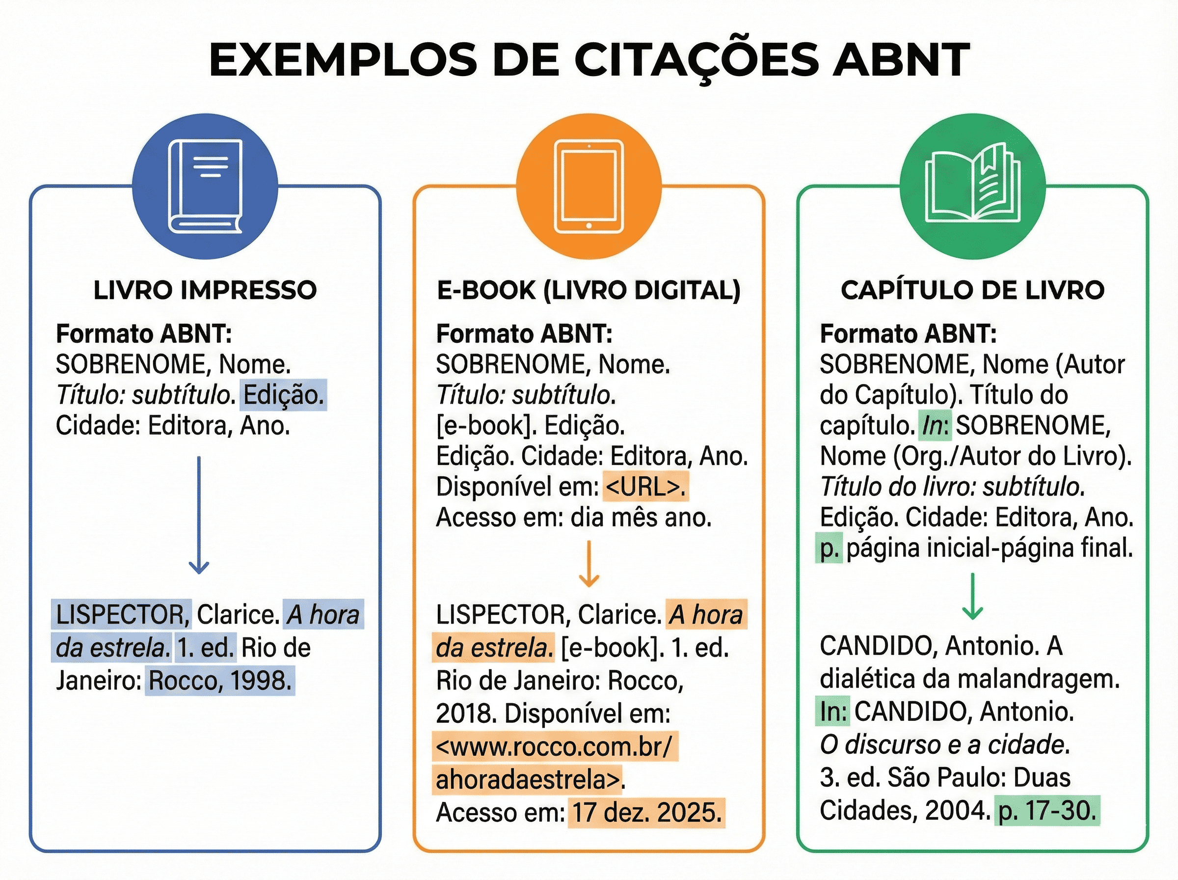 Infografia de exemplos de citações ABNT para livros, e-books e capítulos