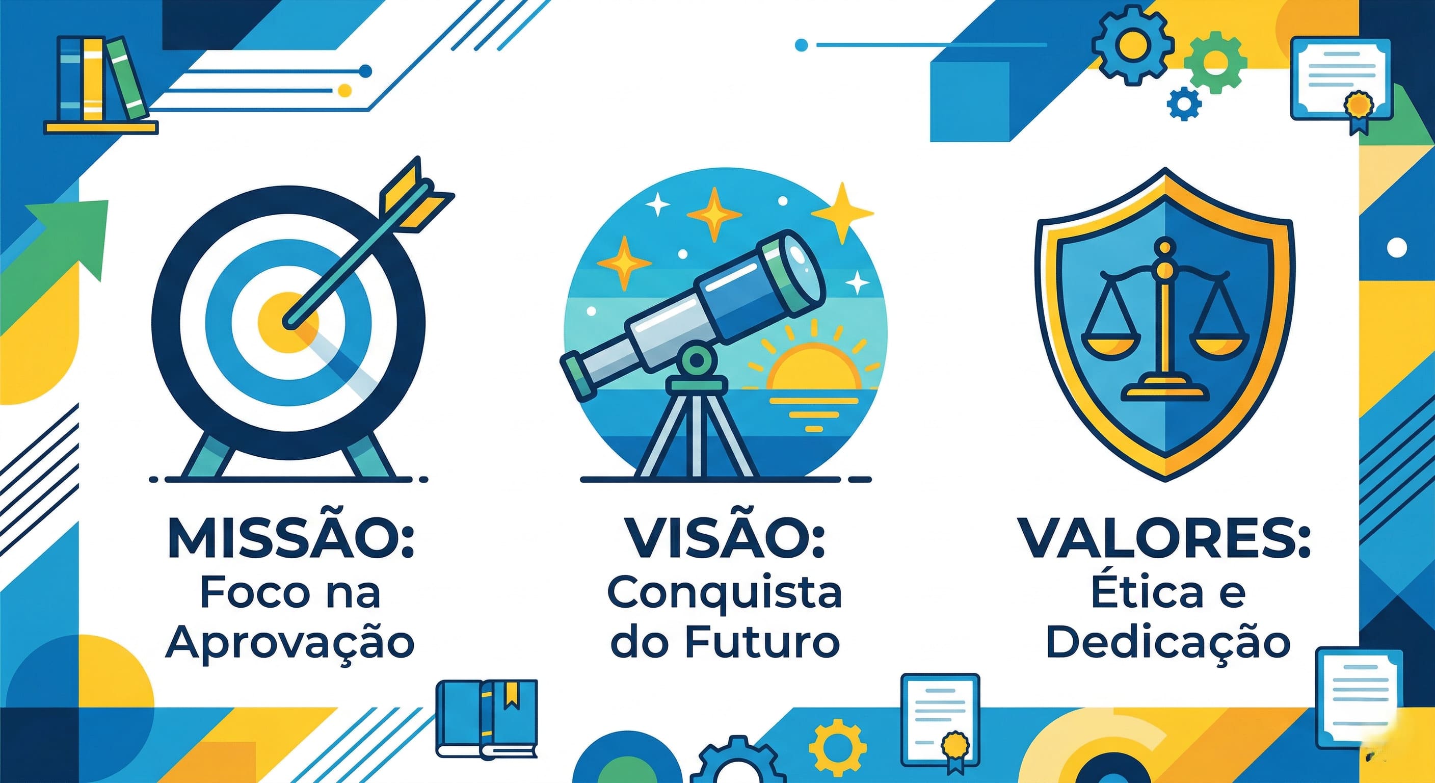 Para que você nunca mais perca pontos preciosos por conta de pegadinhas e para que o seu entendimento seja claro e prático, o segredo para dominar este assunto é focar incansavelmente nas palavras-chave definitivas: Missão é o propósito/razão de existir, Visão é a imagem de futuro desejada (ex: ser reconhecida como a melhor), e Valores são os princípios e crenças da organização.