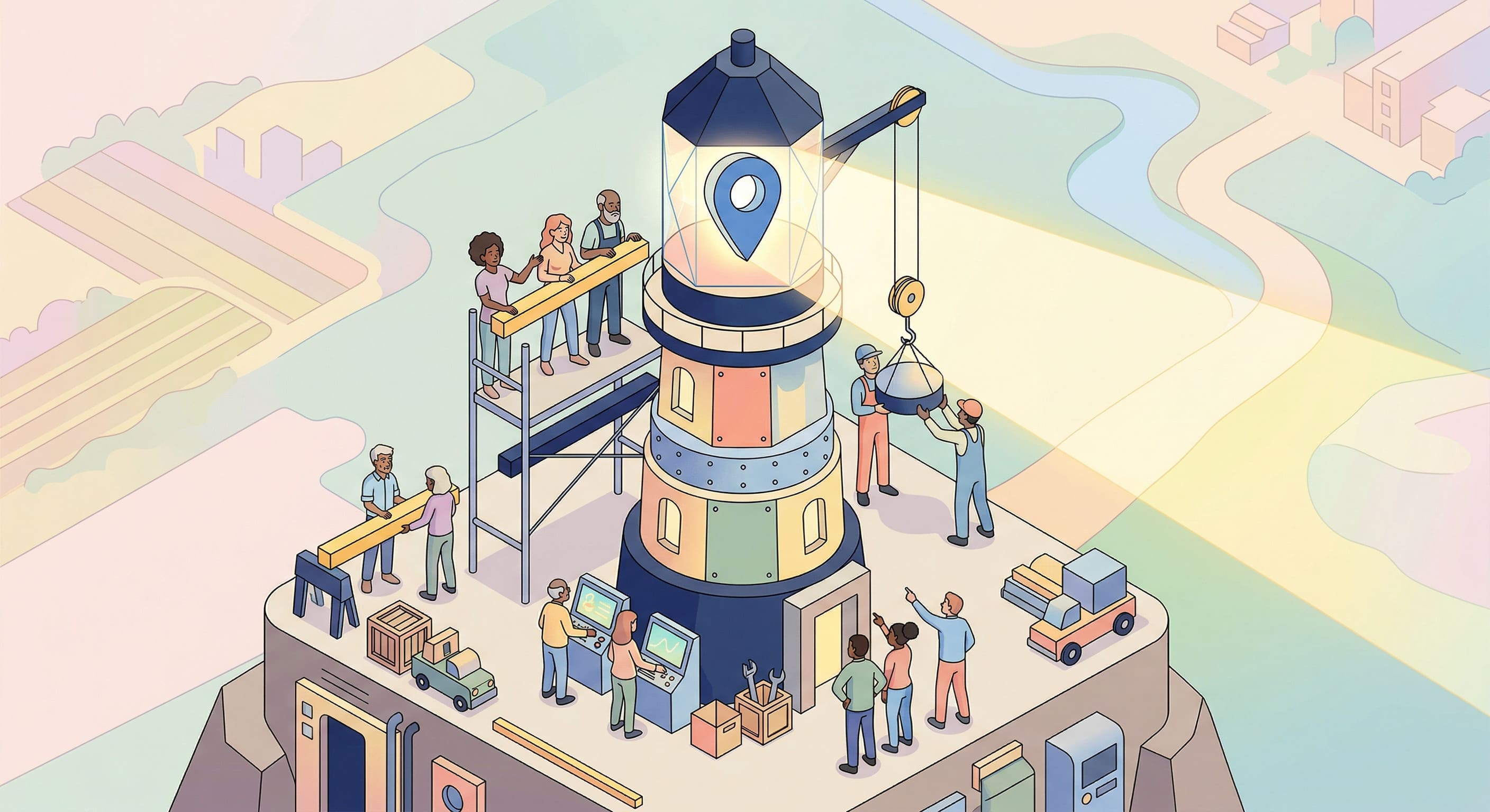 Alt Text: Pessoas trabalhando juntas para acender um grande farol, ilustrando a missão e o propósito de existir de uma organização no presente.