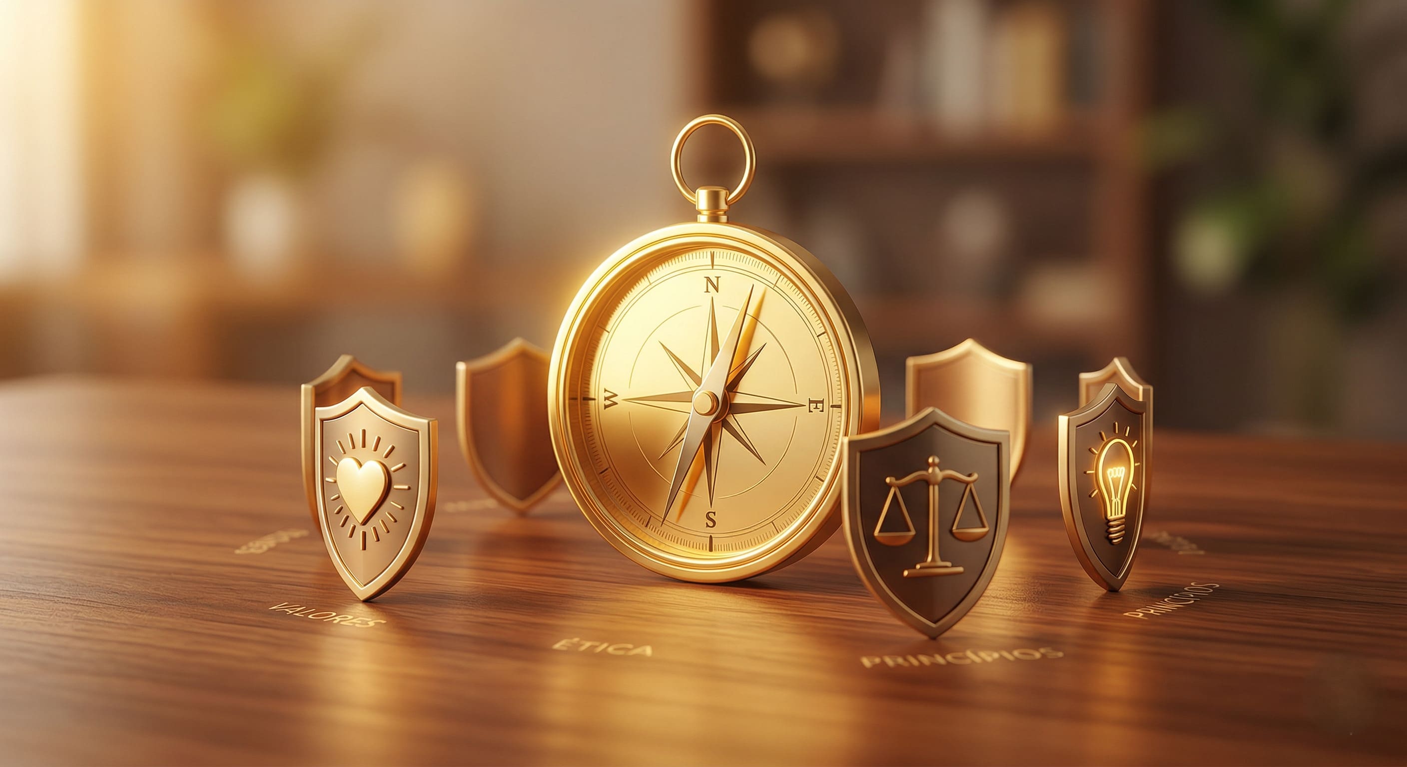 Alt Text: Bússola dourada rodeada por escudos simbólicos, representando os valores, a ética e os princípios morais que guiam as decisões das organizações.