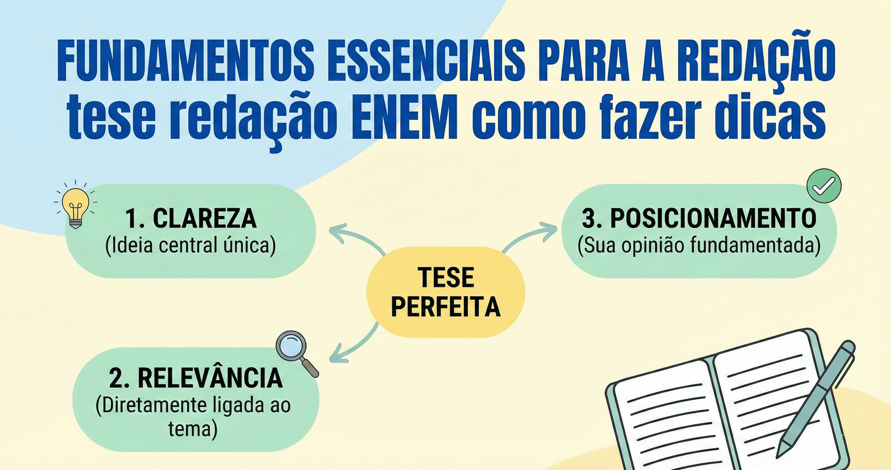 Localização: Geralmente, a tese é apresentada na introdução e retomada/reforçada na conclusão. No ENEM, espera-se que seja uma frase objetiva que resuma o encaminhamento dos parágrafos de argumentação.