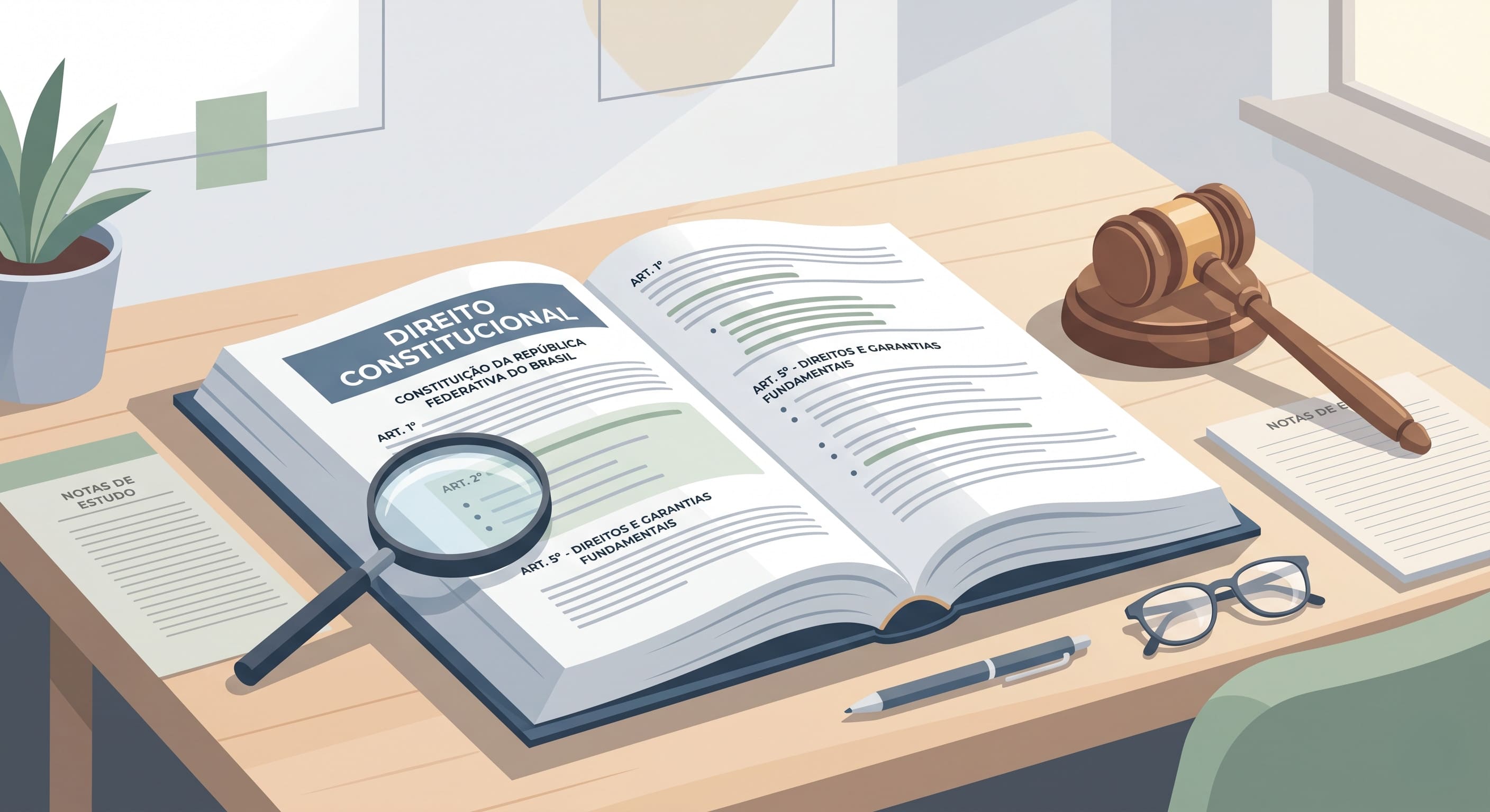 Alt text acessível: Ilustração de um livro de Direito Constitucional aberto com um martelo de juiz e uma lupa, representando a preparação estratégica para concursos públicos e vestibulares.