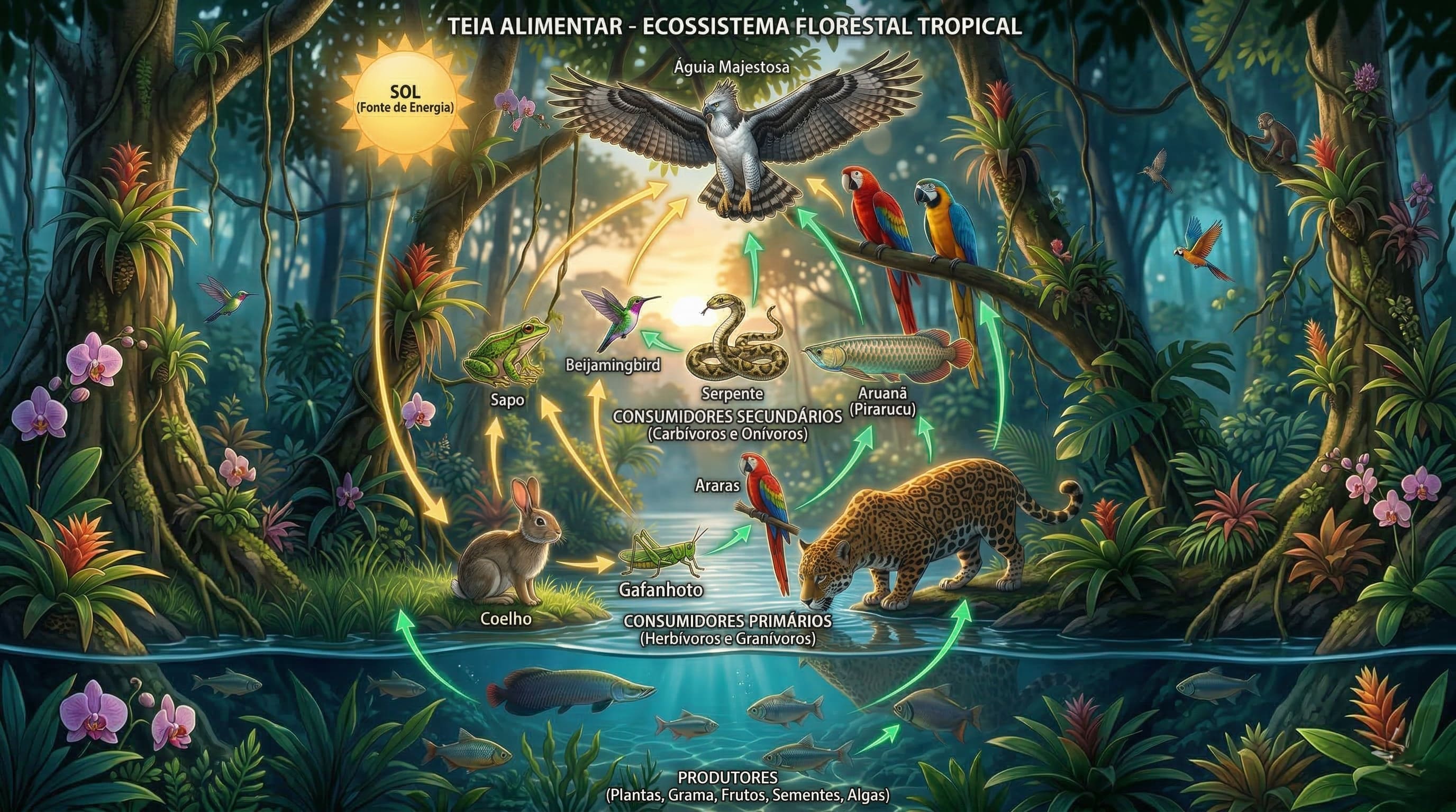 Alt Text: Diagrama ilustrativo de uma teia alimentar com setas mostrando o fluxo de energia desde as plantas até os grandes predadores em um ambiente natural.