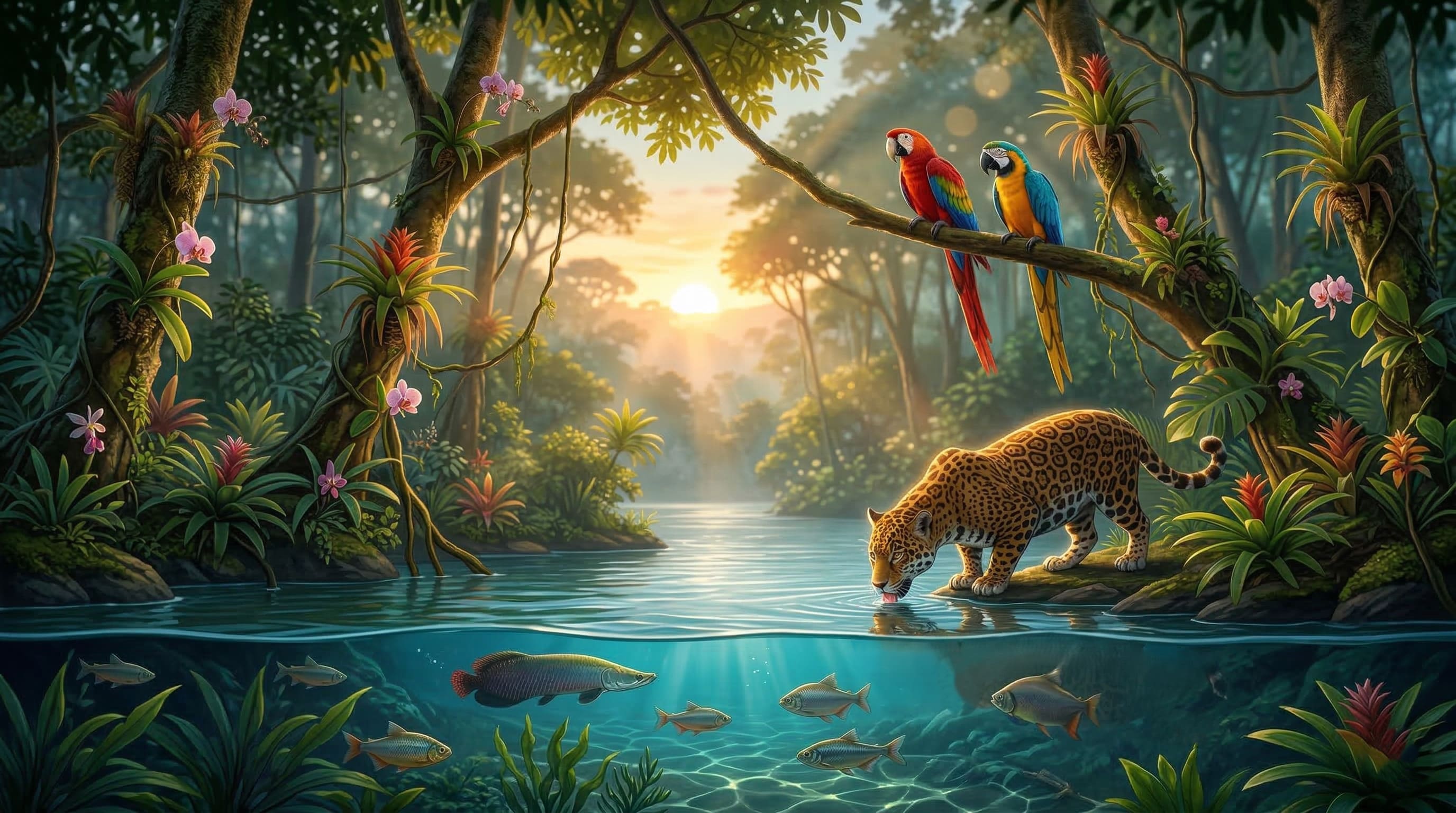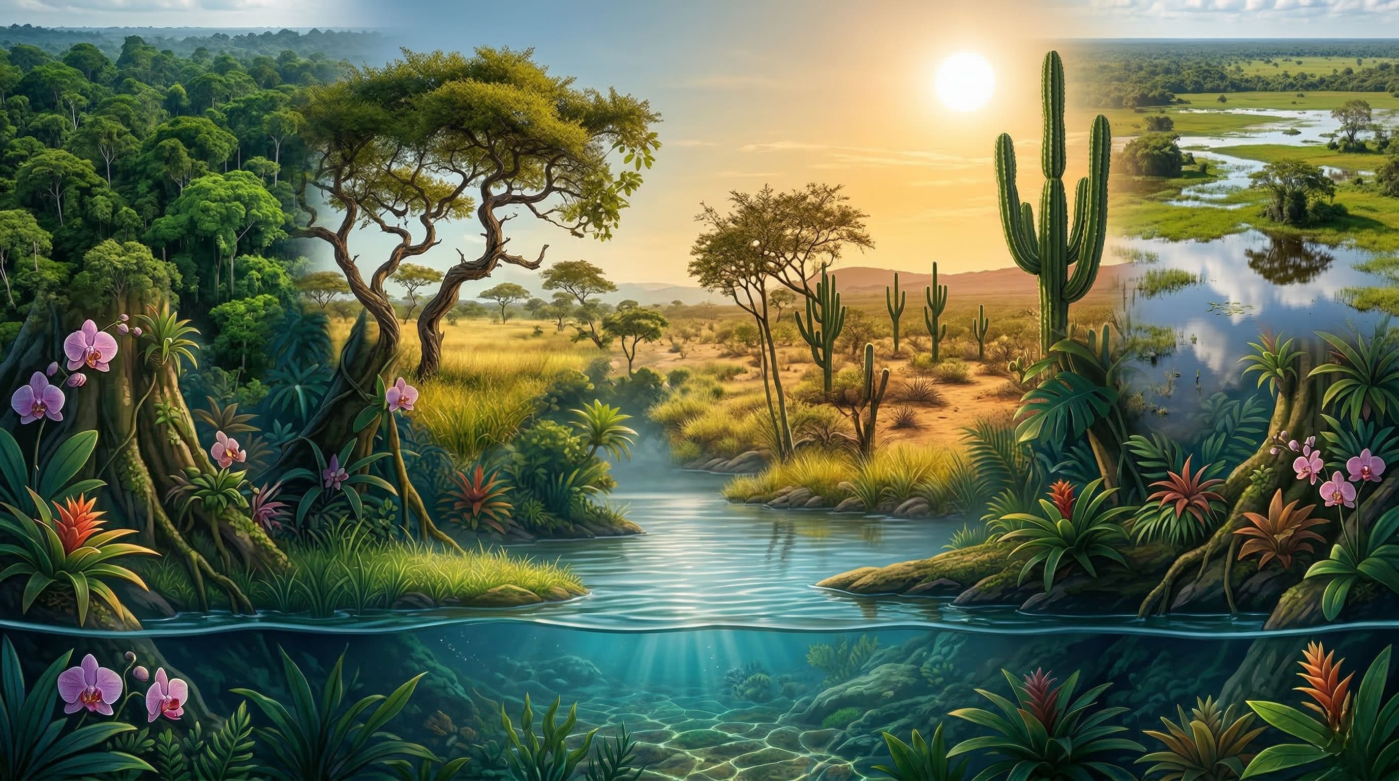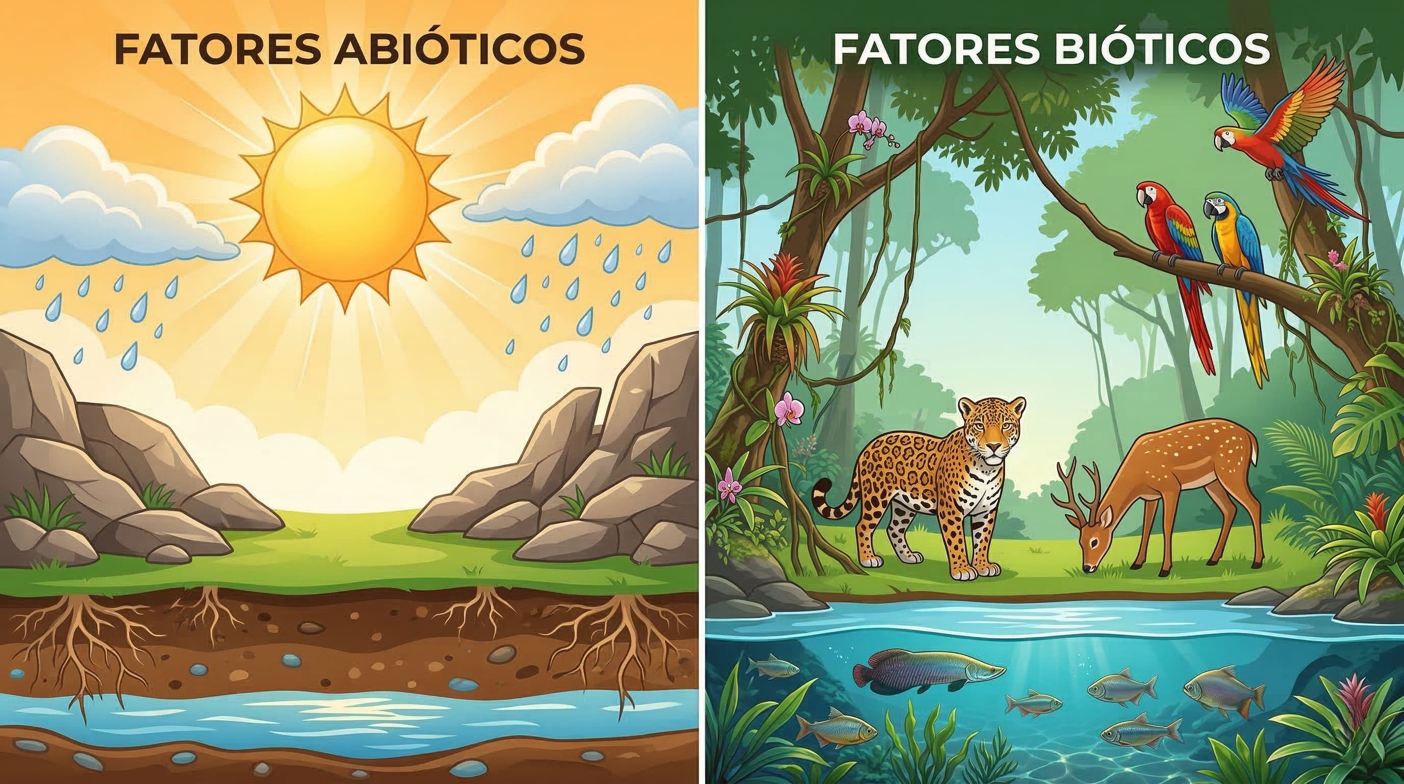 Alt Text: Ilustração digital de um ecossistema vibrante mostrando a interação entre animais, plantas, luz solar e água, representando a ecologia.
