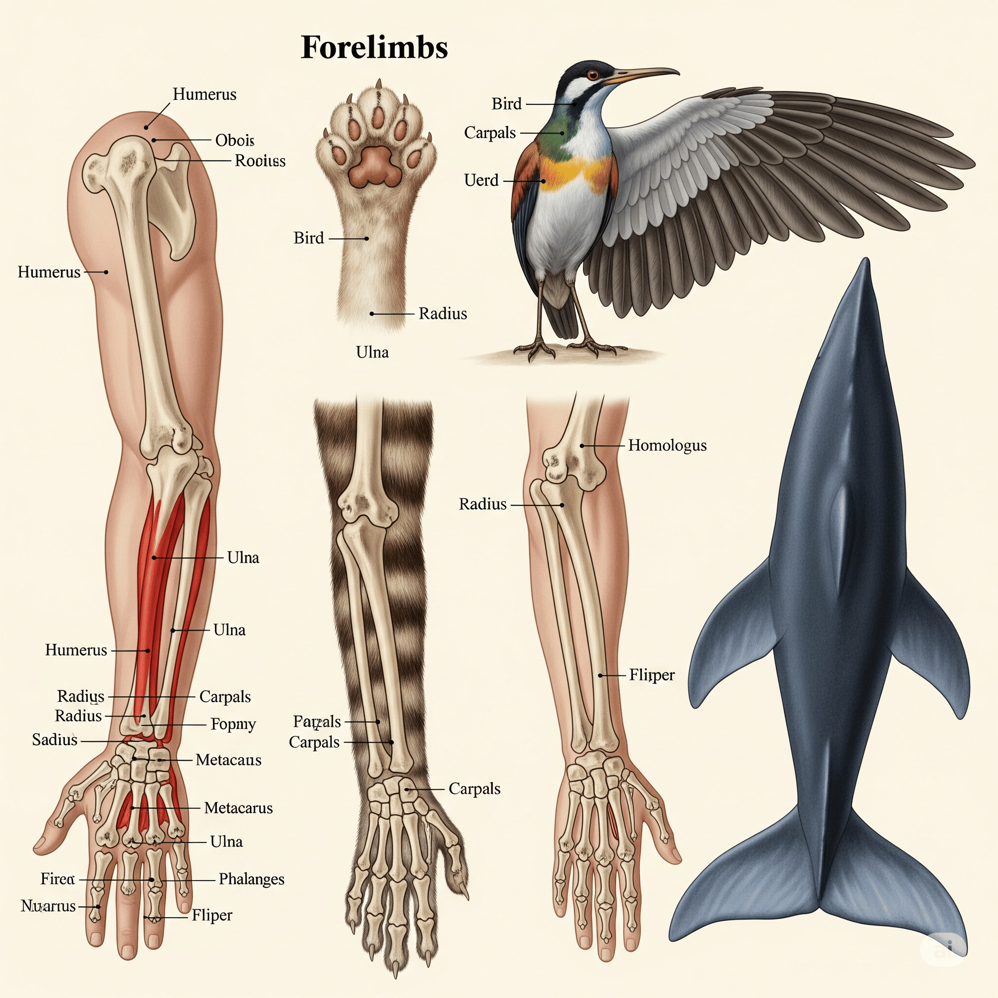 Embora a asa de um morcego, a nadadeira de uma baleia, a pata de um cavalo e o braço humano desempenhem funções muito diferentes (voar, nadar, correr, manipular), eles compartilham um padrão ósseo subjacente notavelmente semelhante: um osso longo no braço/perna superior (úmero/fêmur), dois ossos no antebraço/perna inferior (rádio e ulna/tíbia e fíbula), seguidos por ossos do punho/tornozelo (ossos do carpo/tarso) e dedos (falanges).
