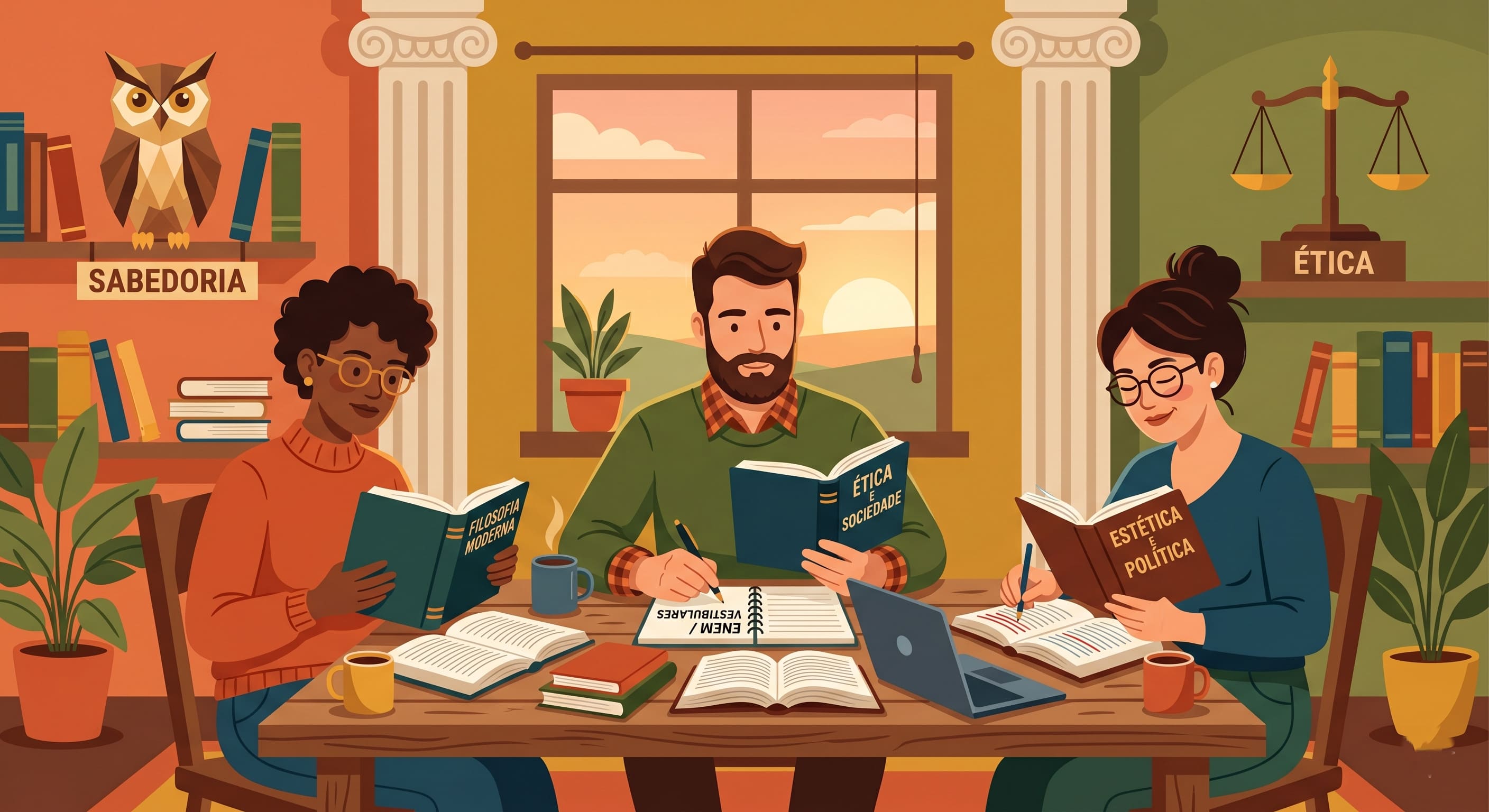 Alt text: Ilustração de estudantes adultos focados lendo livros, cercados por símbolos do conhecimento filosófico, representando a preparação eficaz para o ENEM e vestibulares.