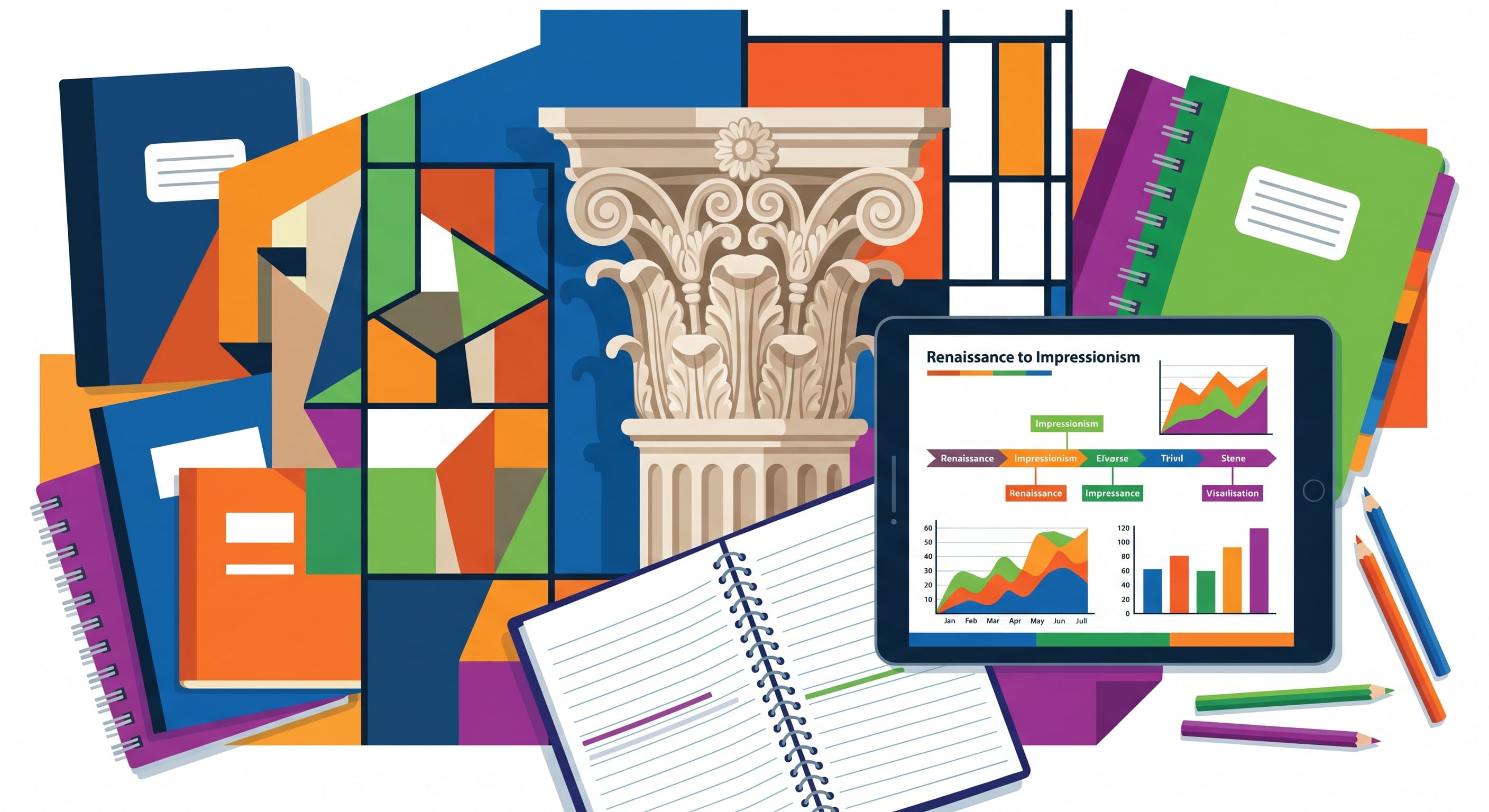 Alt text acessível: Ilustração colorida mesclando elementos de obras de arte clássicas e contemporâneas com ferramentas de estudo modernas, representando a preparação educacional na disciplina de História da Arte.