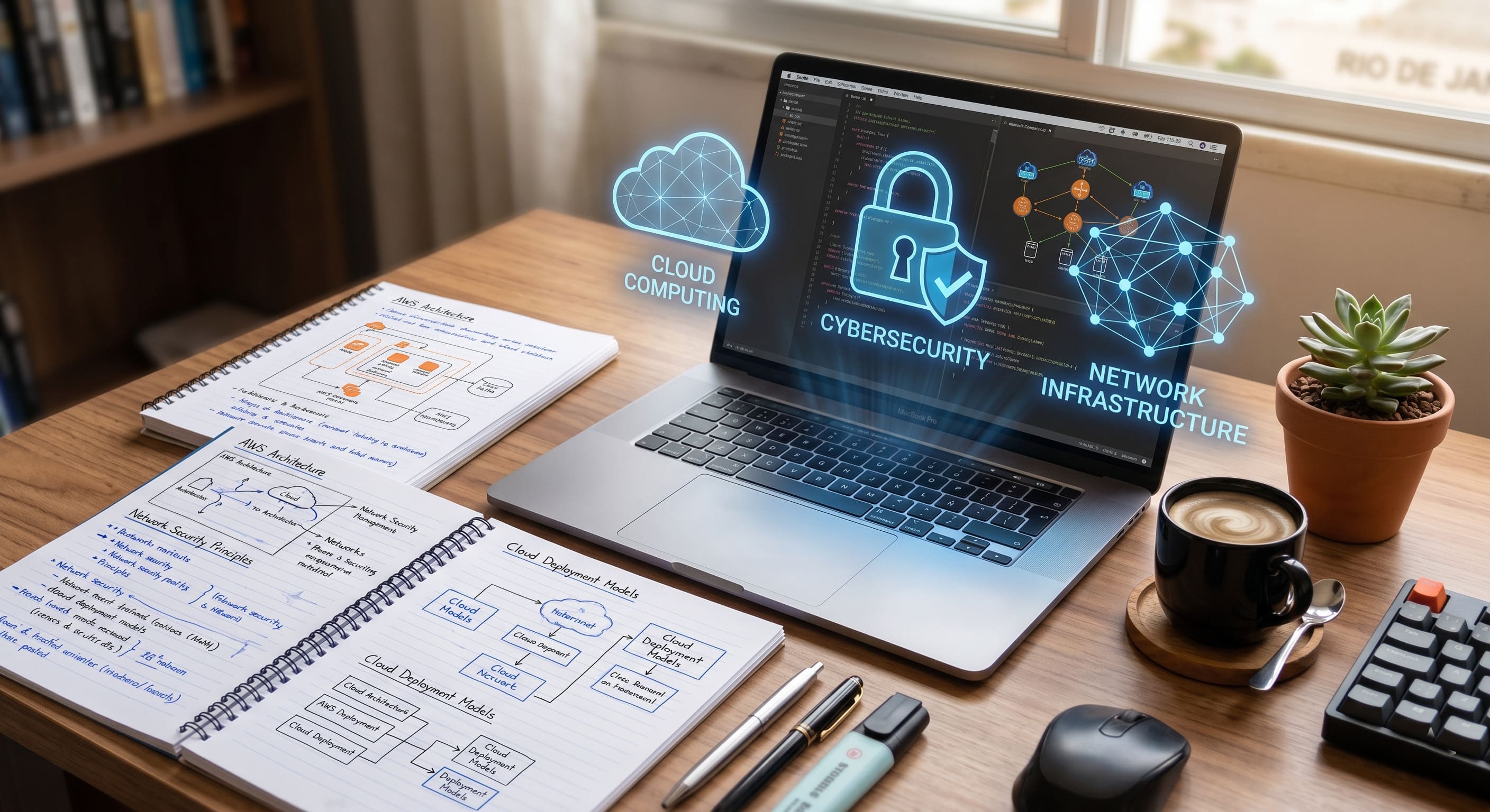 Alt text acessível: Mesa de estudos organizada com um notebook aberto e ícones holográficos flutuantes que representam redes de computadores, nuvem e segurança da informação, ilustrando o estudo de tecnologia para provas.